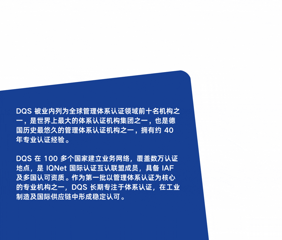 2026年2月,DQS 成功获得美国国家标准学会国家认可委员会 (ANAB) 的认可,可正式提供 ISO/IEC 42001 人工智能管理系统 (AIMS)的认证服务。