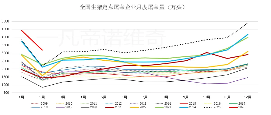 2026年2月全国生猪定点屠宰企业屠宰生猪3177万头,环比下降27.9%,同比增长40.7%。