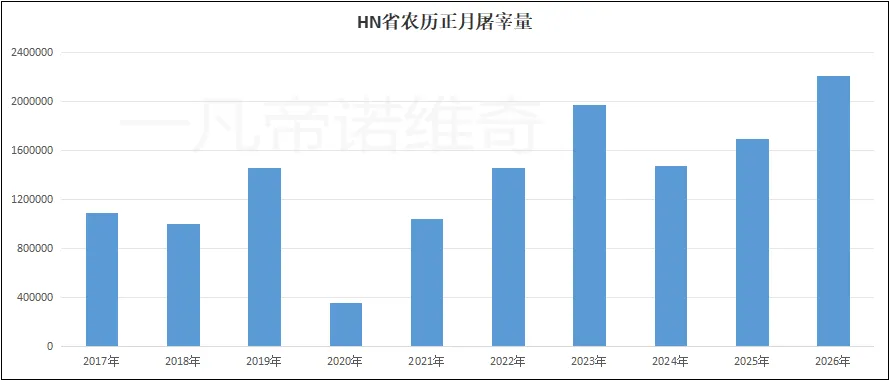 2026年农历正月HN省共屠宰生猪220.57万头,同比增长30.01%。