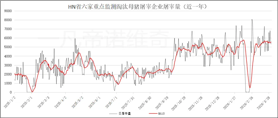 3月,生猪价格震荡回落,屠宰量震荡回升,持续创出历史同期新高。七、HN省重点淘汰母猪屠宰企业屠宰量