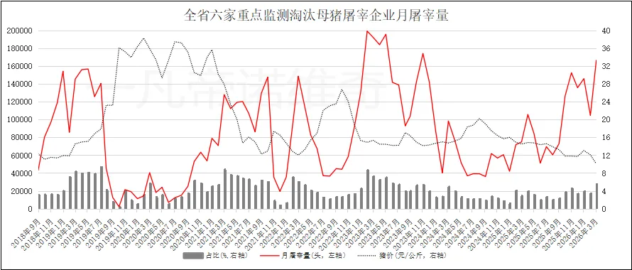 HN省六家重点监测淘汰母猪屠宰企业3月总屠宰量为16.65万头,环比增长58.92%,同比增加122.25%,占全省总屠宰量的比例为5.5%,占比较上月上升2.07个百分点。