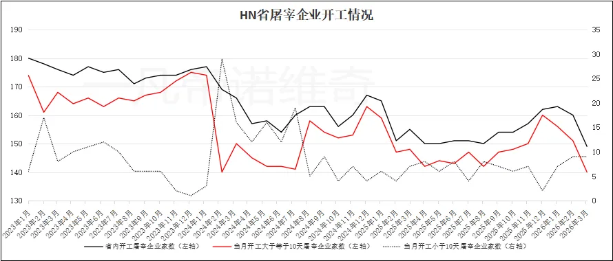 HN省2026年3月有开工记录的屠宰场共149家,环比2026年2月减少11家,比去年同期减少6家,其中屠宰天数小于10天的屠宰企业维持9家,开工数大于10天的屠宰企业140家,比上个月减少11家。