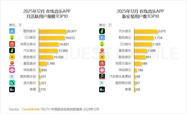 从QuestMobile2025年12月的报告数据来看,截至2025年12月,中国数字音乐市场的前四名分别是酷狗音乐、QQ音乐、网易云音乐和汽水音乐,尽管腾讯音乐旗下两大平台(酷狗和QQ音乐)虽仍占据前两名,但领先优势已大幅收缩。