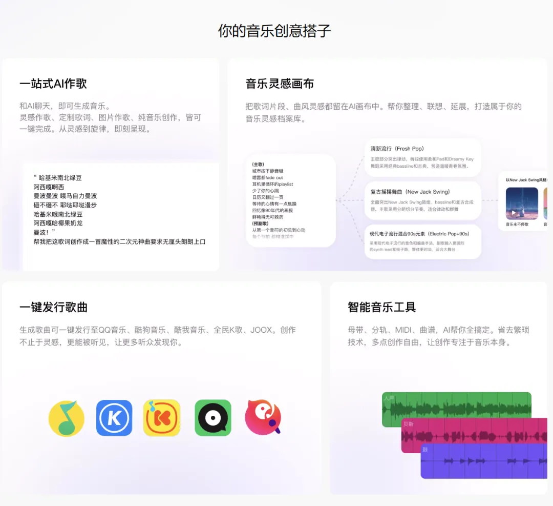 AI音乐的制作主打简易、一站式制作,大部分平台与模型都强调「一句话创作」「对话创作」「灵感创作」,这几乎成为了AI音乐的基本操作。并且此类模型往往放在音乐平台的直观入口,便于用户体验和感受。