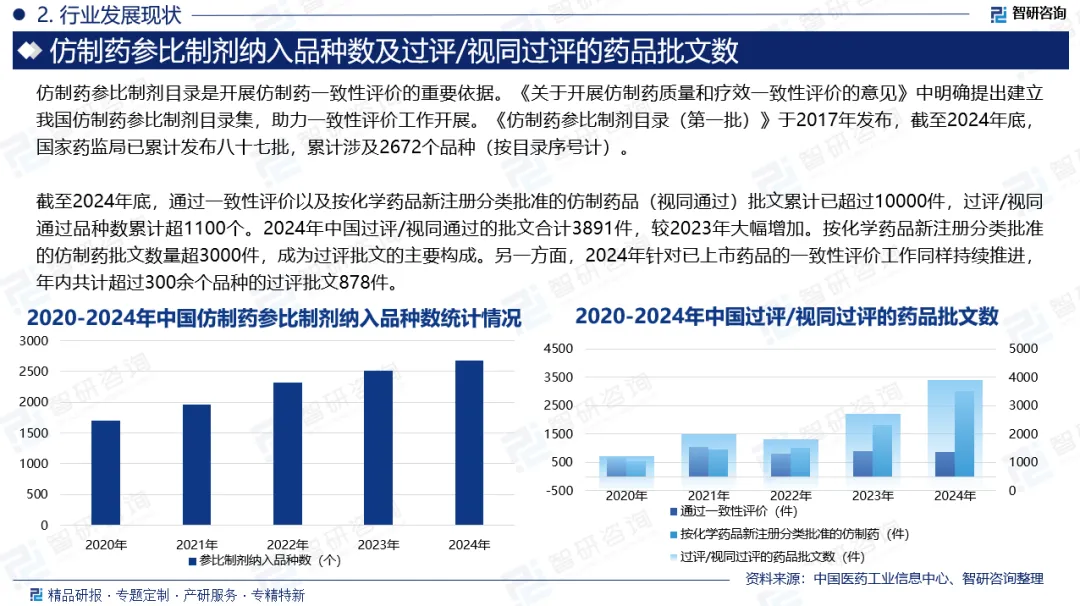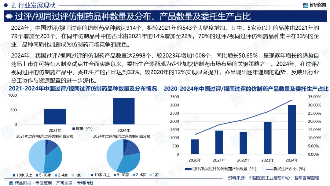 仿制药一致性评价是指对已经批准上市的仿制药,按与原研药品质量和疗效一致的原则,分期分批进行质量一致性评价,就是仿制药需在质量与药效上达到与原研药一致的水平。仿制药一致性评价的流程从确定参比制剂开始,经过药学研究、体外溶出度试验、生物等效性研究,到数据整理与报告撰写,最终完成申报与审批,并进行持续监测与再评价。整个流程强调了仿制药与参比制剂在质量、疗效和安全性上的高度一致性,确保仿制药能够达到与原研药品相同的临床效果。通过以上流程,仿制药的一致性评价旨在确保仿制药与原研药品在疗效和安全性上具有高度一致性,从而保障患者用药的安全性和有效性。仿制药参比制剂目录是开展仿制药一致性评价的重要依据。《关于开展仿制药质量和疗效一致性评价的意见》中明确提出建立我国仿制药参比制剂目录集,助力一致性评价工作开展。《仿制药参比制剂目录(第一批)》于2017年发布,截至2024年底,国家药监局已累计发布八十七批,累计涉及2672个品种(按目录序号计)。截至2024年底,通过一致性评价以及按化学药品新注册分类批准的仿制药品(视同通过)批文累计已超过10000件,过评/视同通过品种数累计超1100个。2024年中国过评/视同通过的批文合计3891件,较2023年大幅增加。按化学药品新注册分类批准的仿制药批文数量超3000件,成为过评批文的主要构成。另一方面,2024年针对已上市药品的一致性评价工作同样持续推进,年内共计超过300余个品种的过评批文878件。自2017年首批过评药品名单公布以来,先后对已上市的口服制剂与注射制剂开展一致性评价工作,累计已有700余个品种的4500余件批文产品通过评价。2024年存量批文产品的过评数量较2021年有所回落,其中年内首次通过一致性评价的品种数从前期的200余种下降至71种。与此同时,年内一致性评价补充申请数量出现下降,从2023年的1006件减少至659件。从过评数据和过评申请上看,口服与注射制剂存量产品的过评工作已过高峰期,滴眼剂、贴剂、吸入剂等其他剂型的一致性评价或将成为重点。2024年,中国过评/视同过评的仿制药品种数达914个,相较2021年的543个大幅度增加。其中,5家及以上的品种由2021年的79个增加至203个,在同年仿制品种中的占比由2021年的14%增加至22%。70%的过评/视同过评仿制药品种集中在33%的企业,品种同质化加剧成为仿制药市场竞争的底色。从品种维度来看,2024年的增长主要由既往过评品种的持续获批推动,2024年内首次过评/视同通过批准的新品种为169个,涉及450件过评批文。其中注射用头孢唑肟钠、二羟丙茶碱注射液与艾曲泊帕乙醇胺片为热门新增品种,各品种年内均有超10家企业的产品过评,2024年新增3000余件过评批文数为既往已过评品种。他达拉非片、磷酸奥司他韦胶囊、间苯三酚注射液与己酮可可碱注射液等既往过评品种的企业数量进一步增加,2024年各品种均新增20余家企业。近年来,政策因素持续深刻影响着我国仿制药行业的发展格局。药品上市许可持有人制度、药品专利纠纷早期解决机制等政策的落实与完善,进一步优化了行业生态,推动了竞争格局的重塑。2024年,我国过评/视同过评的仿制药产品数量达2998个,较2023年增加1008个,同比增长50.65%,呈现逐年增长的趋势自药品上市许可持有人制度试点并全面实施以来,委托生产逐渐成为企业加快仿制药市场布局的关键策略之一。2024年,在过评/视同过评的仿制药产品中,委托生产的占比达到33%,较2020年的12%实现显著提升,亦呈现出逐年递增的趋势,反映出行业分工协作与资源配置的进一步深化。当前中国仿制药一致性评价行业竞争格局呈现分化态势。头部制药企业凭借资金、技术及品种数量优势,已建立起显著领先地位,并通过评价后的市场独占期快速抢占份额。大量中小企业则因资金压力和研发能力有限,面临淘汰或转型,行业集中度正持续提升。目前,中国仿制药一致性评价代表企业包括杭州泰格医药科技股份有限公司、浙江华海药业股份有限公司、深圳市海王生物工程股份有限公司、安徽山河药用辅料股份有限公司、浙江京新药业股份有限公司、深圳信立泰药业股份有限公司、江苏恒瑞医药股份有限公司、华润双鹤药业股份有限公司、浙江海正药业股份有限公司、人福医药集团股份公司等。