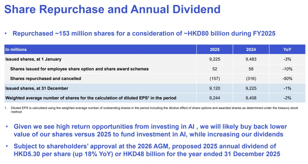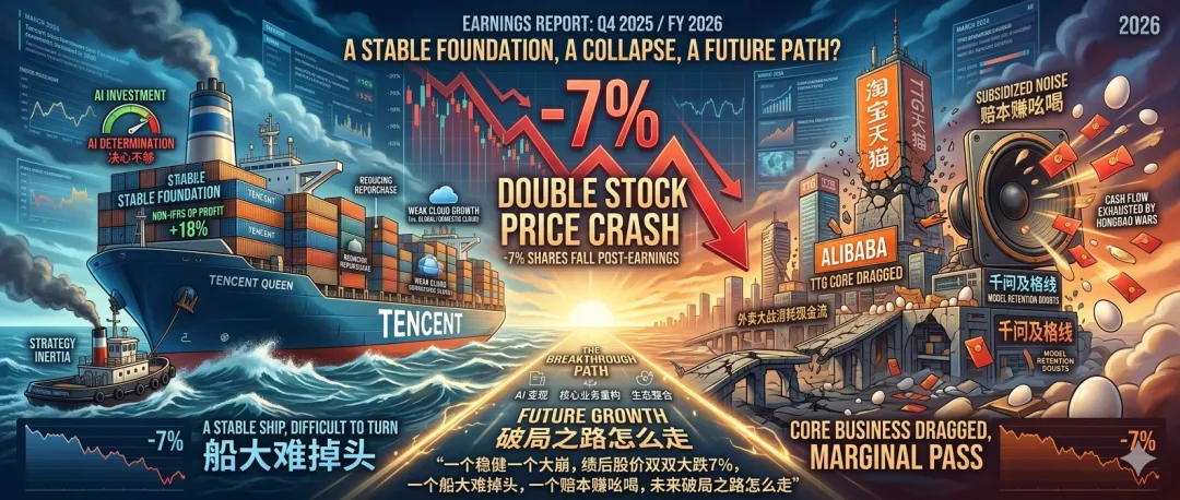 阿里和腾讯近日放榜,最近一直没时间分析一下这两家公司的财报,作为恒生科技、恒生互联网、港股通中国科技、港股通互联网、中概互联等多个热门ETF和相关基金的龙头,我们观察和分析这两家龙头公司的财报能为我们投资上述标的带来不少指引作用。从财报上看,腾讯2025年总收入增长14%,非国际财务报告准则下的经营盈利增长18%,这在当前宏观环境下堪称稳健。然而,市场对这份财报的反馈却是股价大跌,其核心痛点在于“分红逻辑”的动摇。2025年腾讯耗资约800亿港元回购了1.53亿股,这种强力的股份注销是过去一年支撑股价的核心动力。但在最新的业绩说明中,管理层释放了一个危险信号:为了加大AI投入,2026年的回购金额可能会低于2025年。对于长期将腾讯视为“高股息/高回购”避险资产的机构投资者来说,这种从“给股东钱”到“烧钱搞研发”的转变,直接导致了绩后资金的踩踏式撤离。2. AI 投入的“温水煮青蛙”:决心与规模的错位腾讯在财报中高调宣布加大AI投入,并展示了混元3.0、元宝及WorkBuddy等产品。然而,仔细审视其资本支出发现,腾讯2025年的资本开支虽然有所增长,但与字节跳动甚至国际巨头相比,显得极其克制。腾讯计划2026年投入约360亿元人民币用于AI产品,这个数字在AI领域并不算大。对比微软、谷歌单季度超过百亿美元的资本支出,腾讯的投入强度更像是在原有业务上的“修补”,而非开辟新战场的“豪赌”。这种“既要稳利润,又要追技术”的中间心态,让市场担忧其在底层大模型竞赛中会陷入“起大早赶晚集”的尴尬境地。财报虽然提到云业务实现了规模化盈利,但从增速横向对比来看,腾讯云正面临前所未有的压力。在全球市场,谷歌云、微软Azure仍保持30%-40%的高速增长;在国内市场,阿里云本季度收入增长36%。相比之下,腾讯云的增速明显落后于第一梯队。其业务结构依然深度绑定社交与游戏生态,在外部政企市场和AI算力租赁市场(MaaS)的开拓上缺乏侵略性。这种增长的乏力,反映出腾讯在基础设施领域的“轻资产”基因在AI重资产时代遭遇了瓶颈。阿里巴巴的这份财报可以用“惨烈”形容。集团整体收入增速降至2%,这标志着阿里已经从一家成长型公司彻底变成了低速循环的成熟期企业。淘天集团(TTG)在拼多多与抖音的夹击下,GMV与利润的增长几乎停滞,核心商业的盈利能力正在被削弱。更严重的是,归母净利润同比下滑超过60%,虽然其中包含投资减值的影响,但主营业务利润空间的持续收窄是不争的事实。阿里目前处于一种“核心业务失血,新兴业务烧钱”的危险循环中,这也是股价暴跌的核心逻辑。阿里云本季度收入增长36%,看似亮眼,实则处于“保规模”的防守战。AI相关产品连续十个季度三位数增长,很大程度上是依靠大幅度降价和对MaaS生态的强力补贴换来的。尽管千问大模型全端MAU突破3亿,但这种“及格”的数据背后,是极高的获客成本。在B端市场,阿里虽然在金融、制造业有领先优势,但随着华为、腾讯及运营商云的入场,阿里云为了维持市场份额,不得不牺牲利润率,这种“增收不增利”的局面尚未得到根本性扭转。阿里在2026年初发起的“AI红包大战”,试图通过补贴、赠送礼品等互联网时代的传统打法来推广大模型。这种手段虽然短期拉升了APP的下载量和日活,但AI工具与社交、外卖不同,它需要的是极高的用户粘性和生产力转化。这种“赔本赚吆喝”的行为,导致了大量无效用户的涌入,一旦补贴停止,留存度成疑。对于阿里而言,这种昂贵的流量买卖不仅消耗了大量现金流,更暴露了其在AI应用层面缺乏原生场景的焦虑。腾讯未来的机会点不在于烧钱买算力,而在于其无孔不入的微信生态。如果腾讯能将混元大模型深层嵌入视频号、微信搜索及办公助手,实现AI对广告转化率的本质提升,其稳健的财务表现才能重新赢得市场的溢价。阿里目前最急需的是稳住淘天的基本盘。AI对于阿里而言,不应只是云业务的增量,更应是重构电商搜索与推荐逻辑的底层工具。只有当AI能显著降低商家的经营成本并提升消费者体验时,阿里才能从“补贴换增长”的泥潭中拔出。两家巨头股价的同日暴跌,本质上是市场对“中概股AI逻辑”的重构。投资者不再满足于看到漂亮的MAU或口头上的重视,而是开始审视谁能真正把AI转化为现金流,谁能在减少股东回购后,拿出更具爆发力的业绩证明。腾讯需要克服“船大难掉头”的战略惯性,投入真正的重金去构建底层护城河;而阿里则需要结束“赔本赚吆喝”的营销幻象,回归商业本质。这场关于未来的破局之战,才刚刚开始。• end •