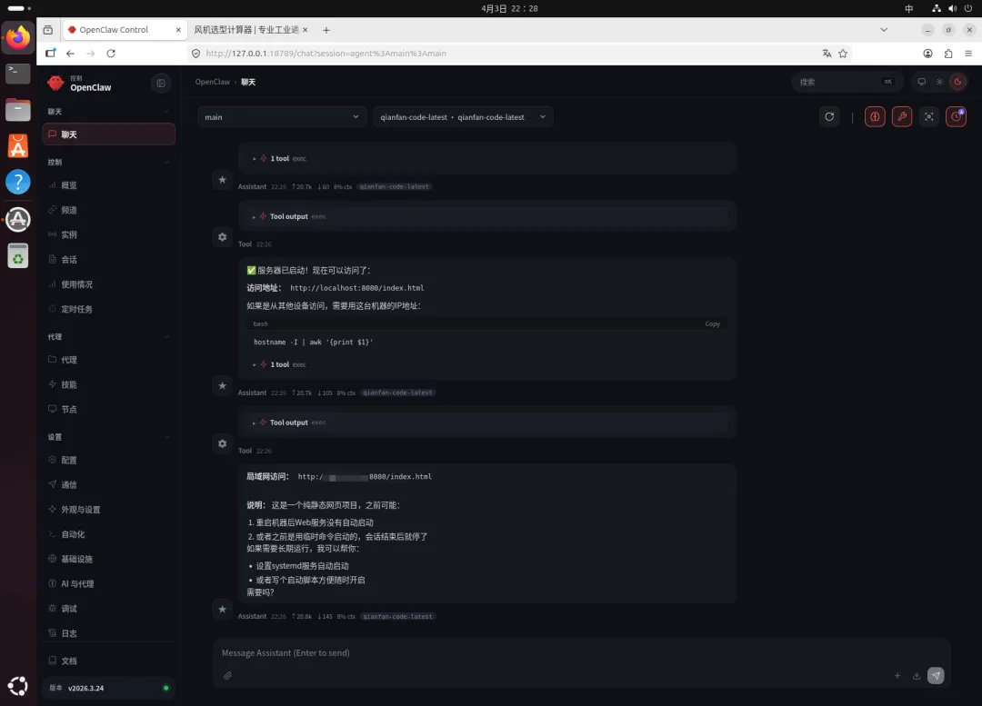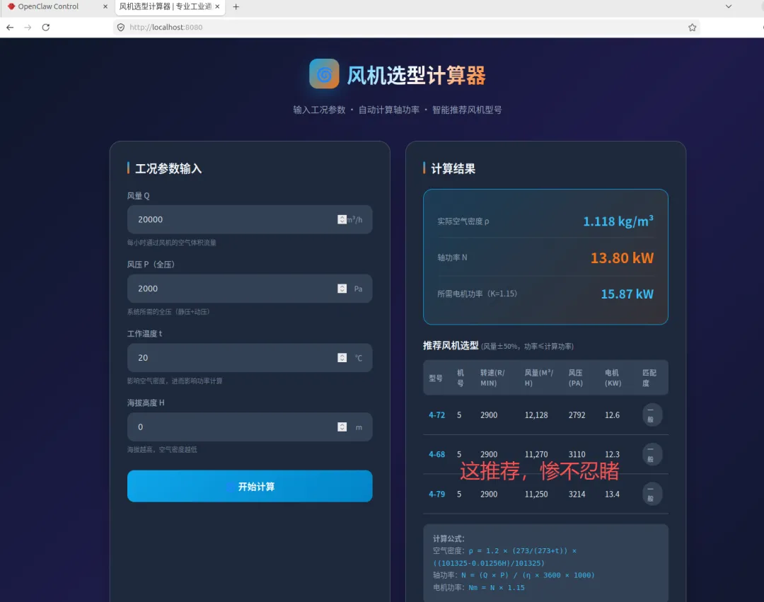 5、我用龙虾干嘛了。收集没人热点,用飞书、还有邮箱发给我,让我早上了解天下热点新闻;自动生成公众号文档,但是感觉都是ai位,暂时还在调试;生成网页,做了个半成品的风机计算选型网页软件,为什么说是半成品呢,计算功率没问题,但是根据我给他的数据去选型,结果太差,有空调试;剩下就是各种新鲜的尝试。