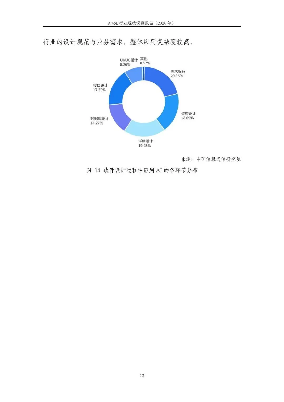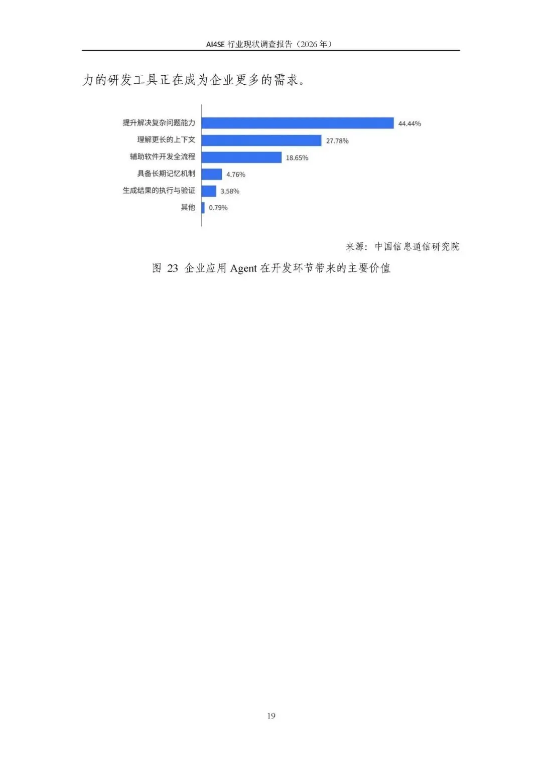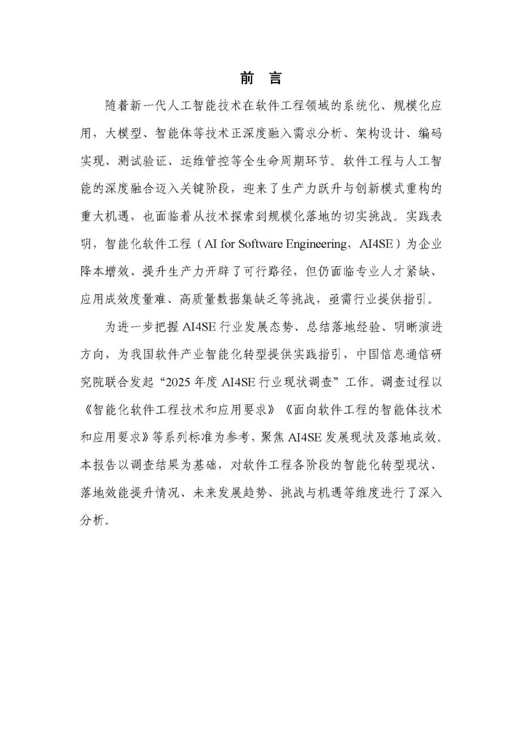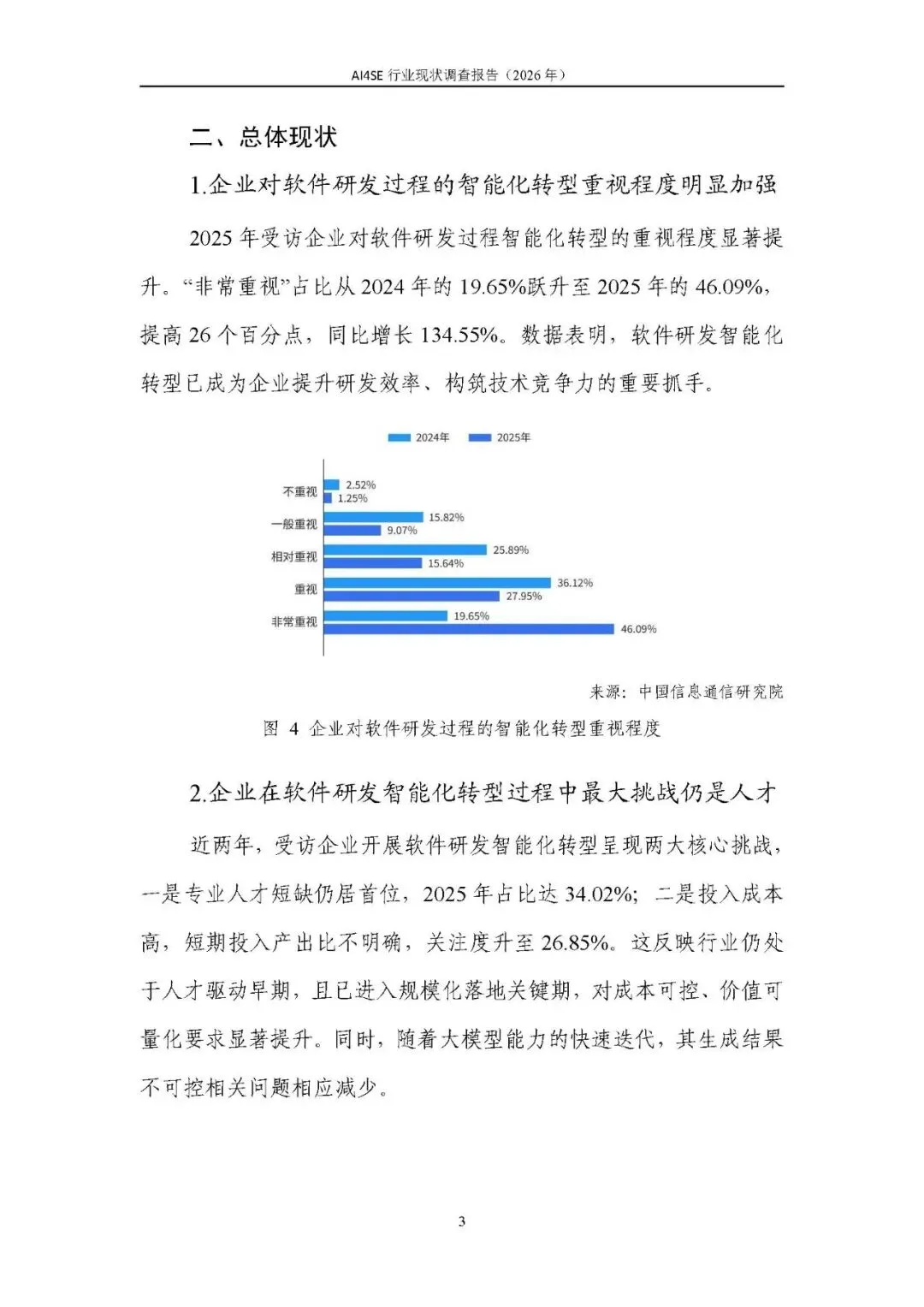 这份信通院 2026 年 AI4SE 行业现状调查报告,核心是 AI 与软件工程深度融合进入规模化落地关键期,全流程提效显著,企业高度重视,但仍面临人才、成本等挑战,未来将走向自主编程、多智能体协同的新范式。