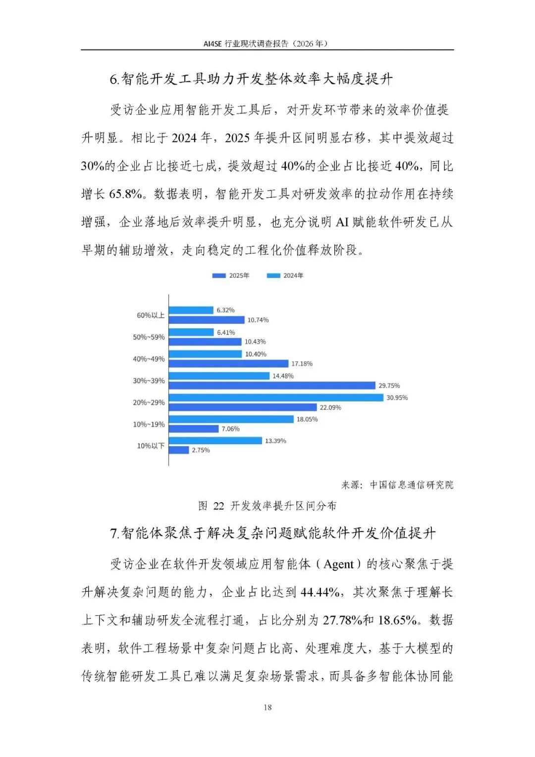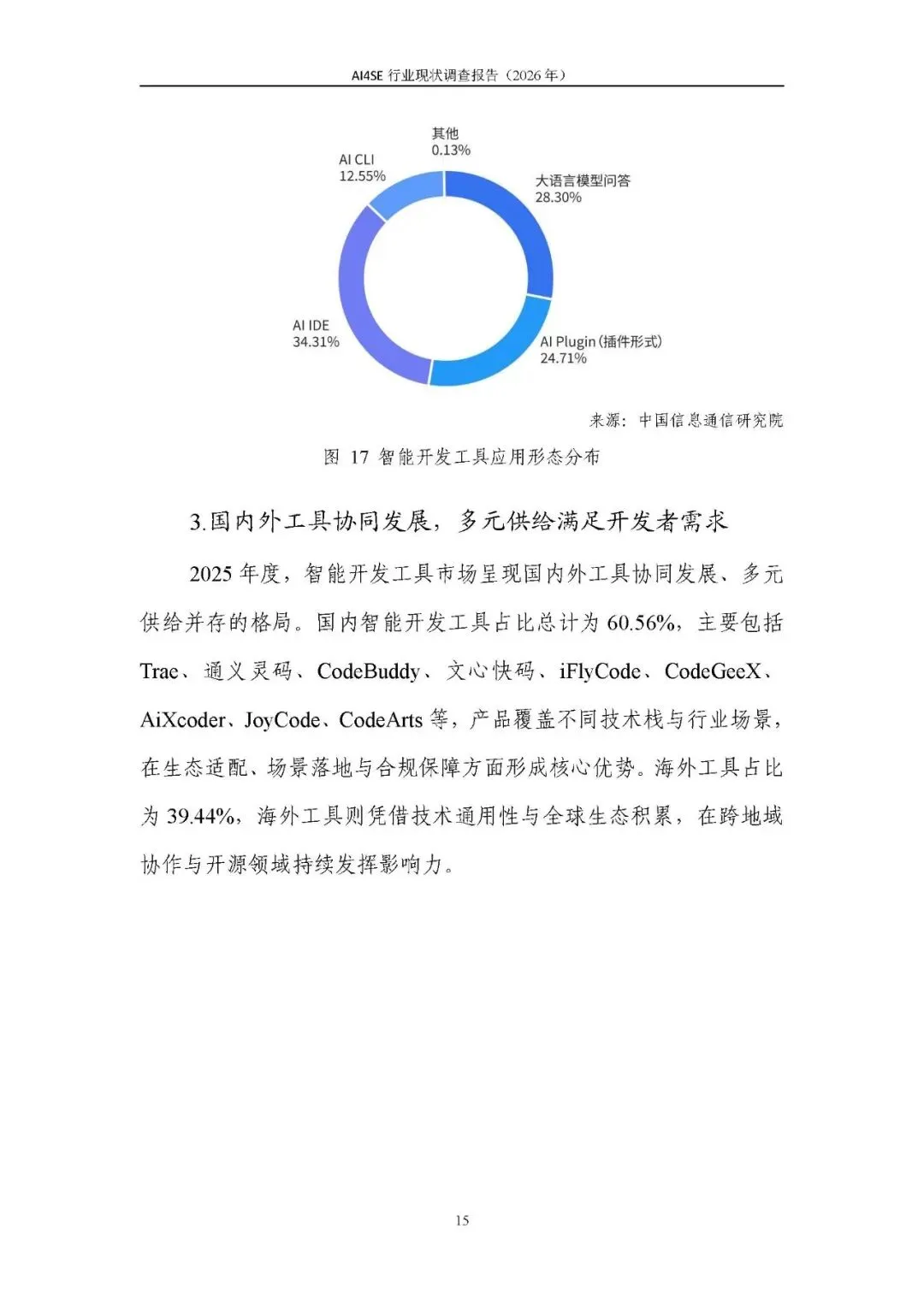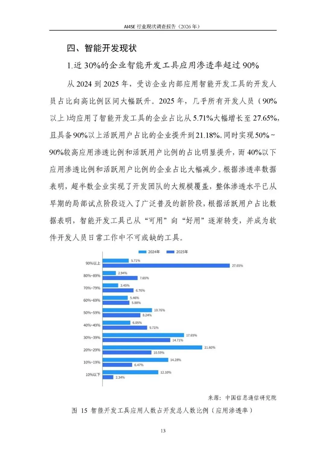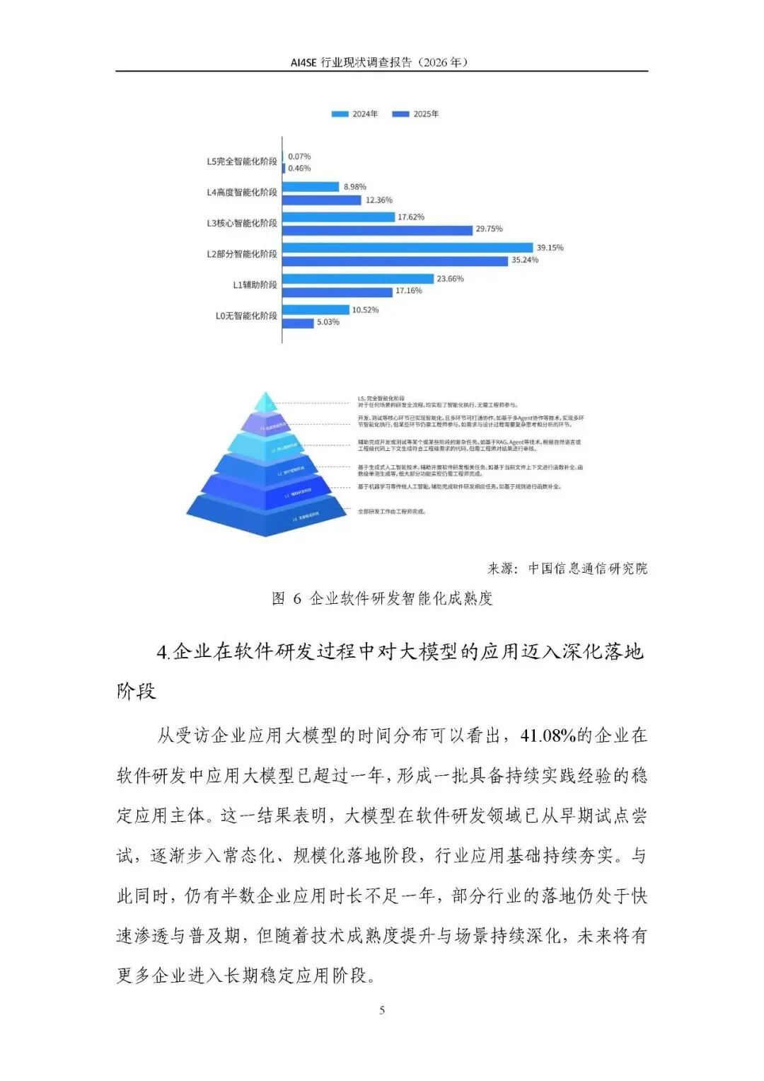 这份信通院 2026 年 AI4SE 行业现状调查报告,核心是 AI 与软件工程深度融合进入规模化落地关键期,全流程提效显著,企业高度重视,但仍面临人才、成本等挑战,未来将走向自主编程、多智能体协同的新范式。