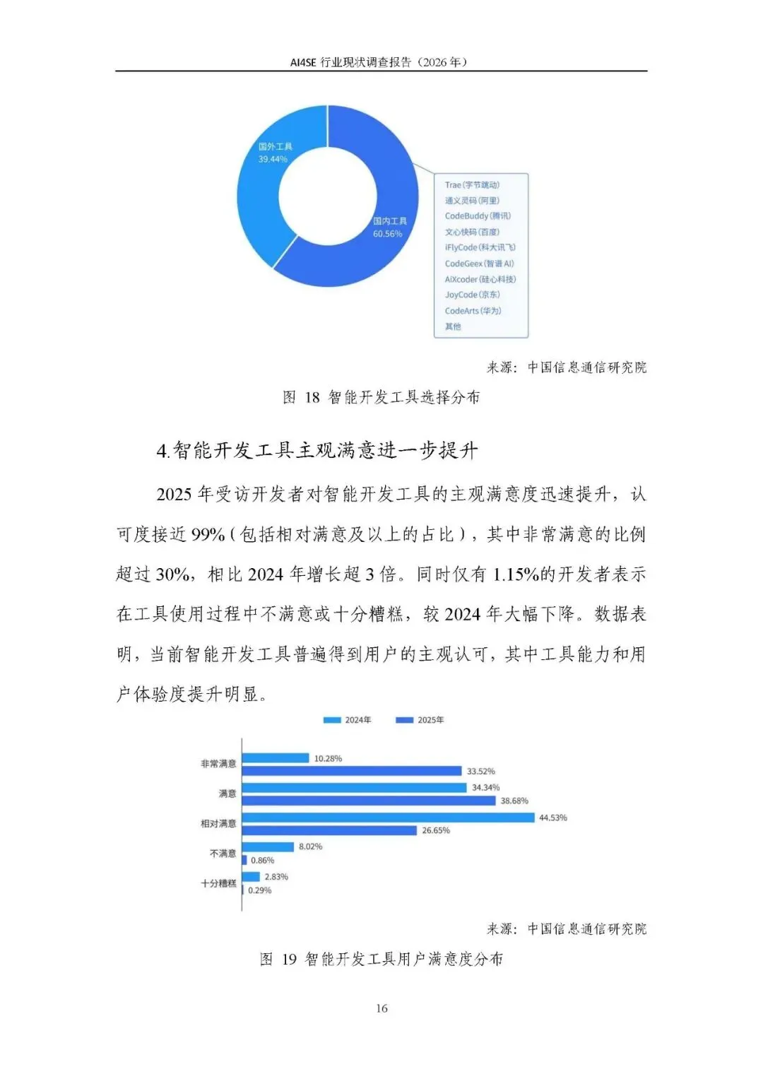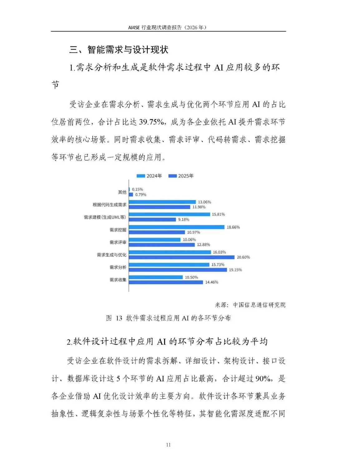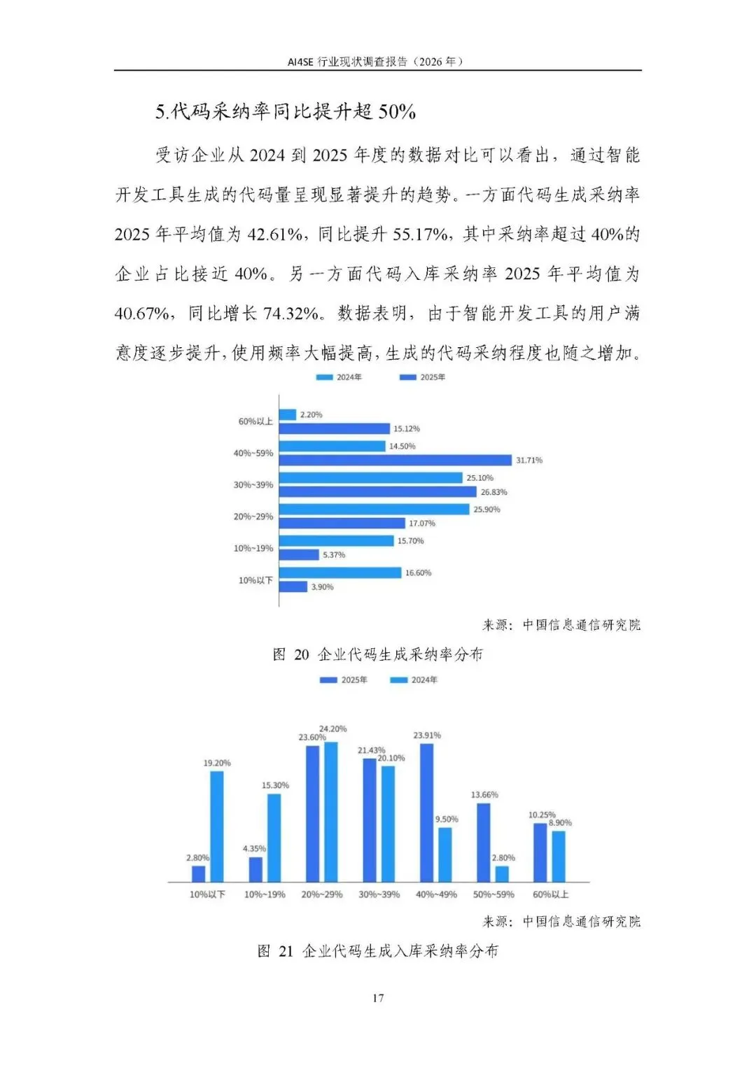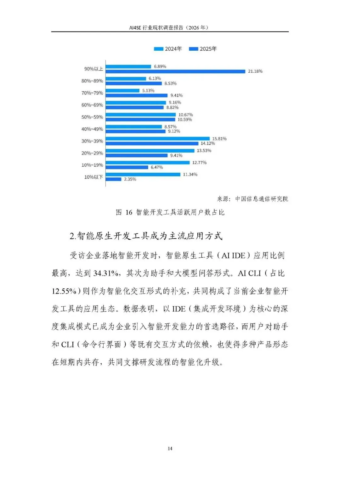 这份信通院 2026 年 AI4SE 行业现状调查报告,核心是 AI 与软件工程深度融合进入规模化落地关键期,全流程提效显著,企业高度重视,但仍面临人才、成本等挑战,未来将走向自主编程、多智能体协同的新范式。