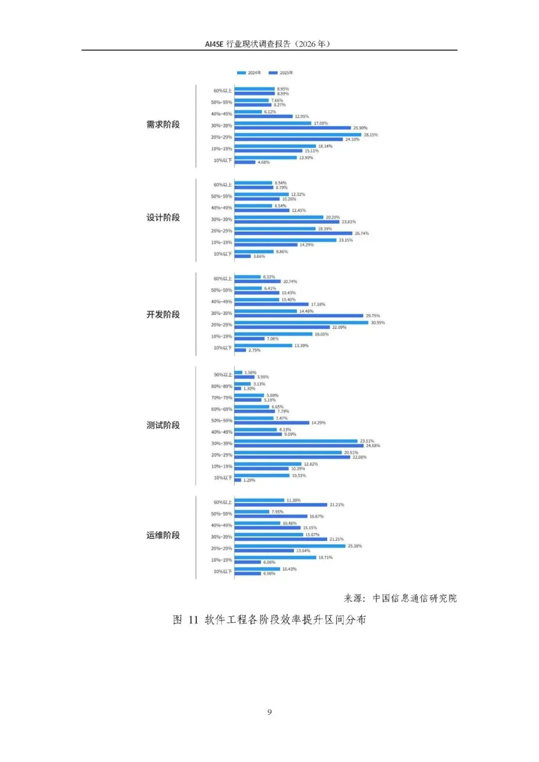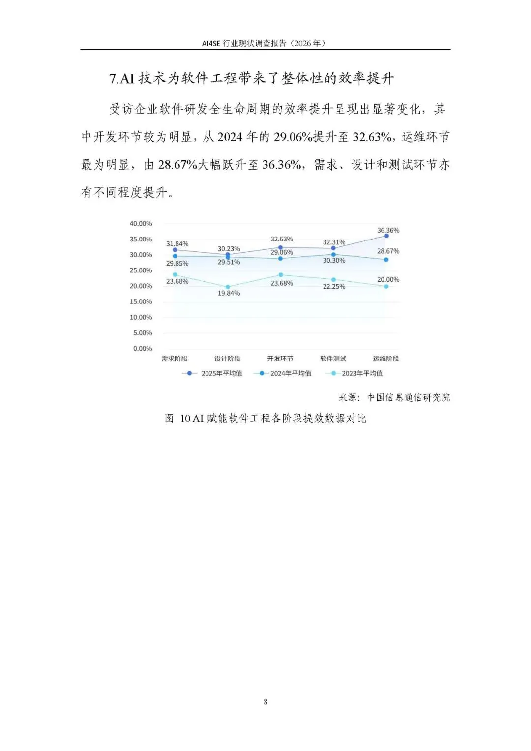 运维环节提效最突出(36.36%),开发(32.63%)、需求 / 设计 / 测试均稳步提升。