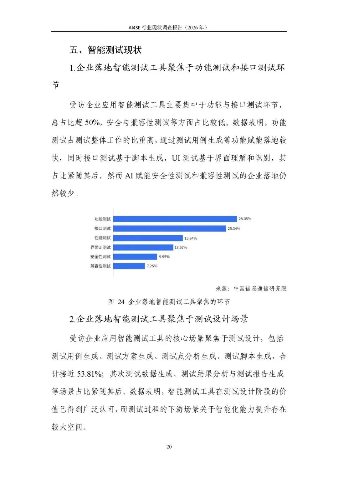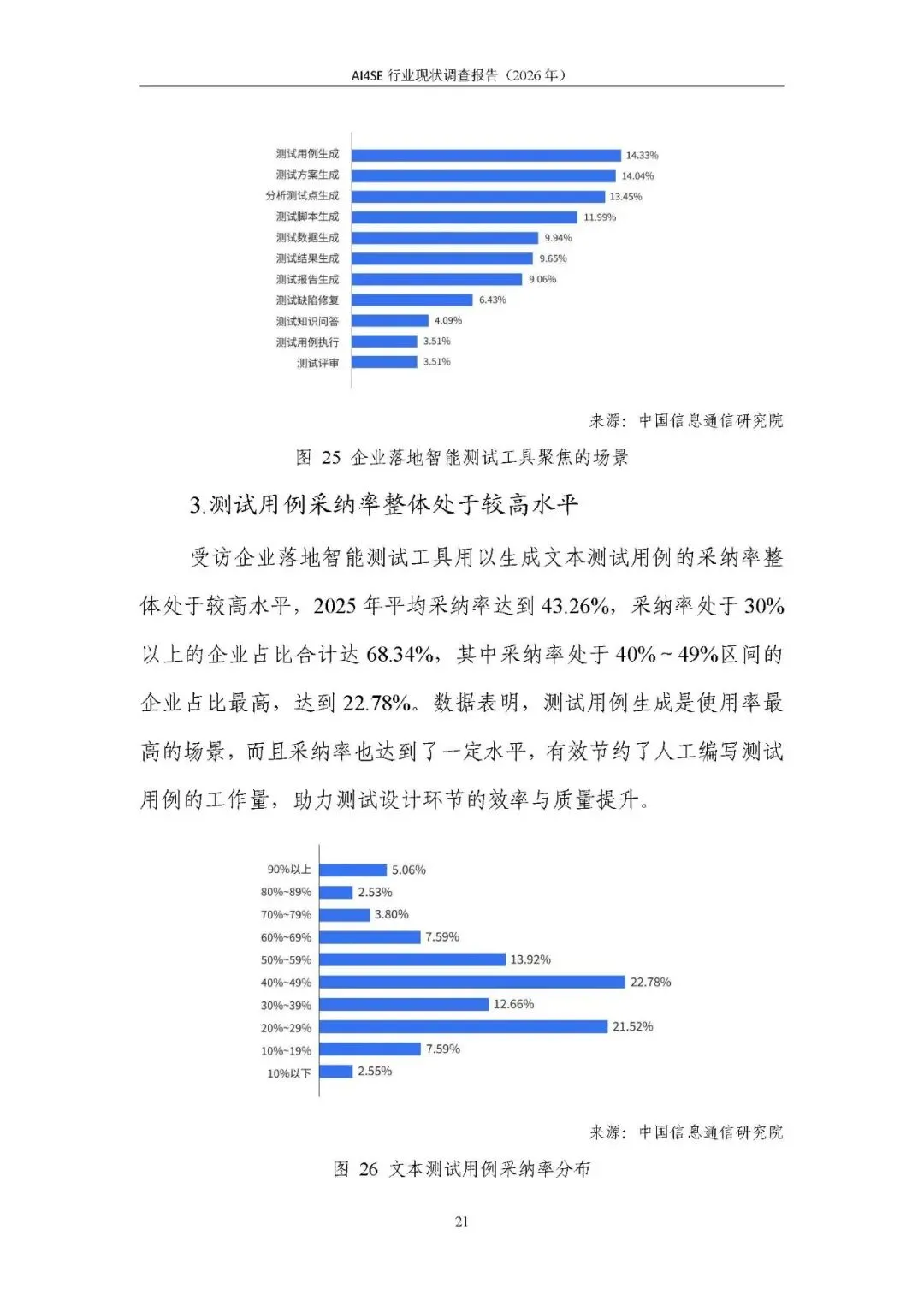 聚焦功能、接口测试;测试用例生成最常用,采纳率43.26%;超六成企业测试提效超30%。