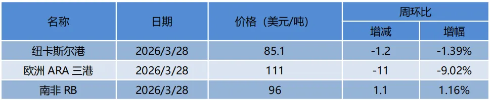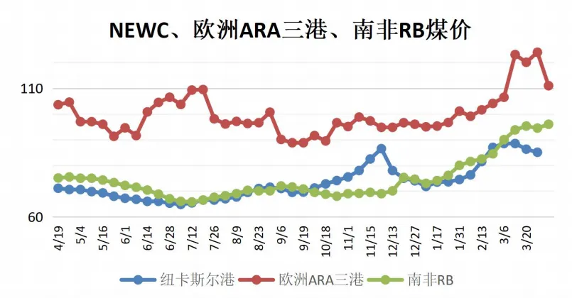国际煤价涨跌分化。截至3月28日,纽卡斯尔NEWC5500大卡动力煤FOB现货价格报85.1美元/吨,周环比下跌1.2美元/吨;ARA6000大卡动力煤现货价格报111.0美元/吨,周环比下跌11.0美元/吨;理查兹港动力煤FOB现货价格报96.0美元/吨,周环比上涨1.1美元/吨。
