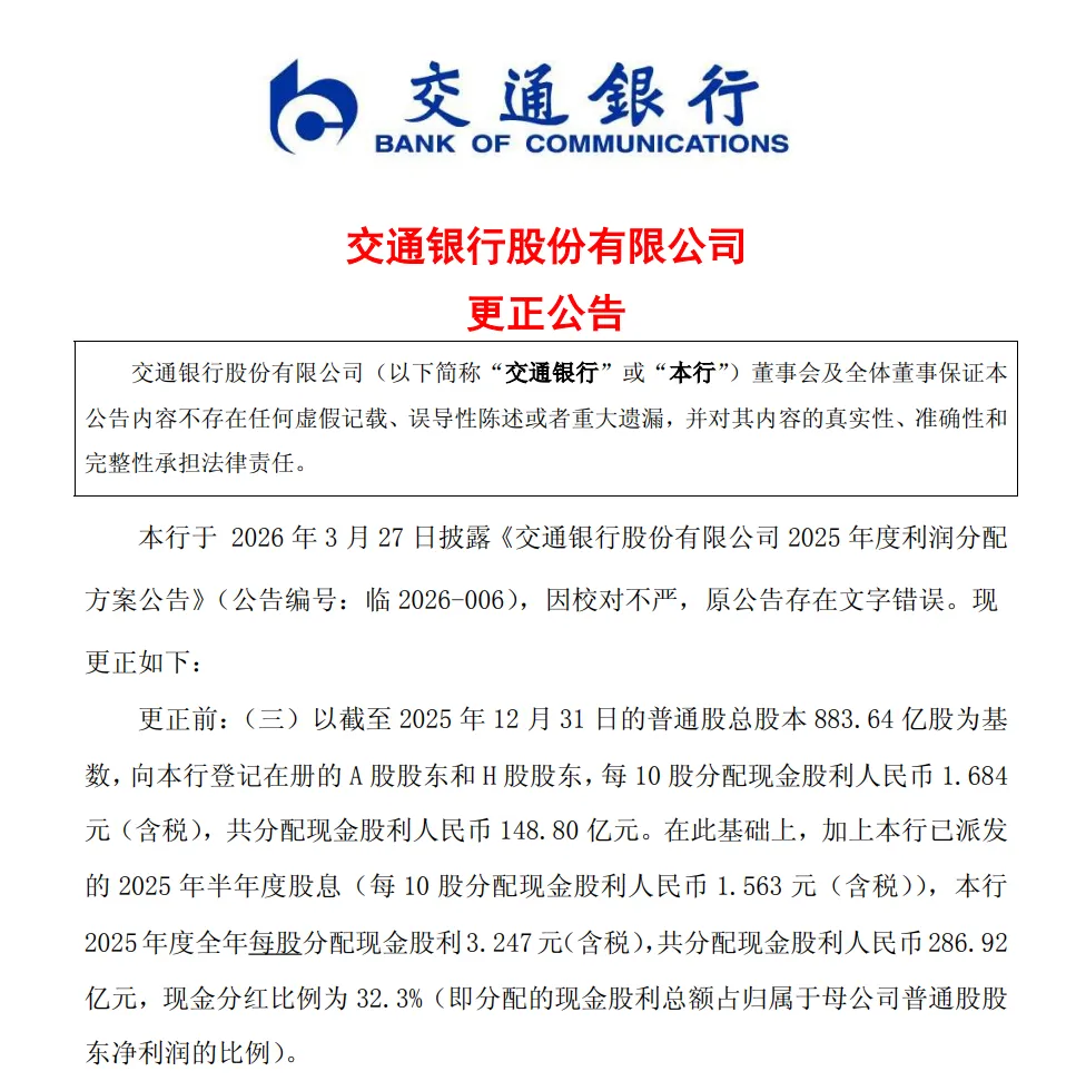 交通银行的差错,仅出现在利润分配方案公告的文字表述环节。该行2025年年报中经审计的营业收入、归母净利润、总资产、净资产、拟分红总额等核心财务数据,均已在年报中准确披露,且与更正后的利润分配方案完全匹配。本次更正仅为修正文字校对失误,并未改变经董事会审议通过的利润分配方案,也不会对该行2025年财报核心财务数据产生任何影响,更不会改变最终向投资者实施的分红金额。