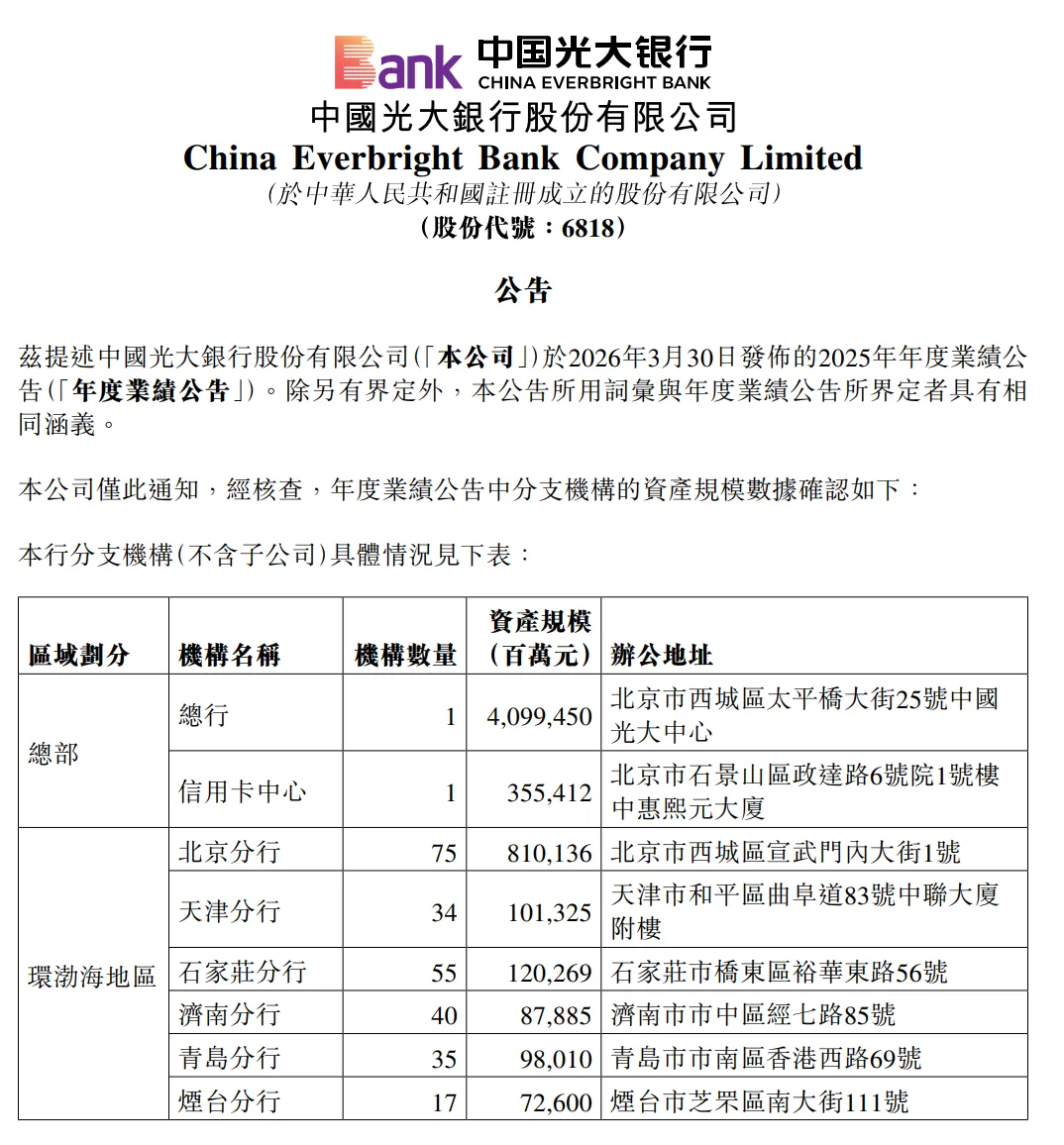 公告内容显示,经核查,光大银行对分支机构的资产规模数进行了确认,对此前在港交所发布的2025年年度业绩公告中的分支机构资产规模相关数据进行变更。