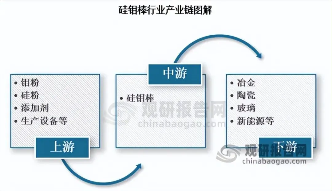 硅钼棒行业产业链上游主要有钼粉、硅粉、添加剂等原材料,高温烧结设备等;硅钼棒主要应用于工业炉,下游覆盖广泛,主要包括冶金、陶瓷、玻璃等行业。