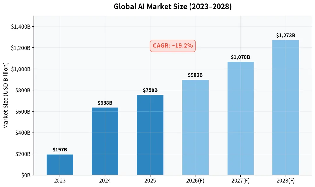 2023至2025年间,全球AI市场展现了显著的扩张态势,得益于基础模型的突破、计算成本的下降以及企业采纳的广泛加速。多家研究机构对超高速增长的叙事保持一致,尽管具体数字因方法论和衡量范围的不同而有所差异。