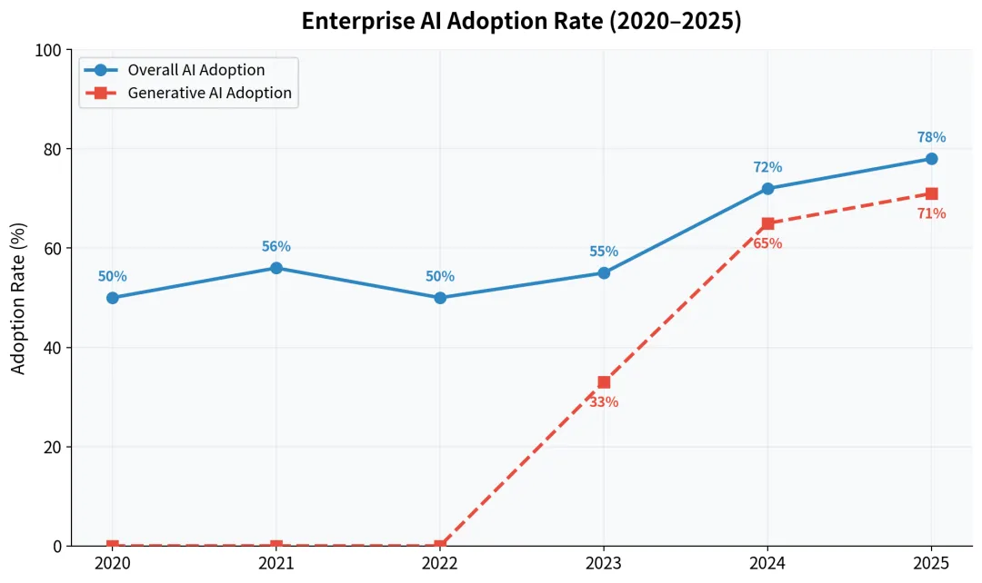 企业AI采纳率加速显著。根据麦肯锡AI状态报告,2024年78%的公司在至少一个业务职能中使用AI,较2023年的55%大幅提升。到2025年,这一数字达到88%。生成式AI的采纳更是爆发式增长,从2023年的33%跃升至2025年的71%。中国以5.15亿生成式AI用户居全球之首(2025年初)。