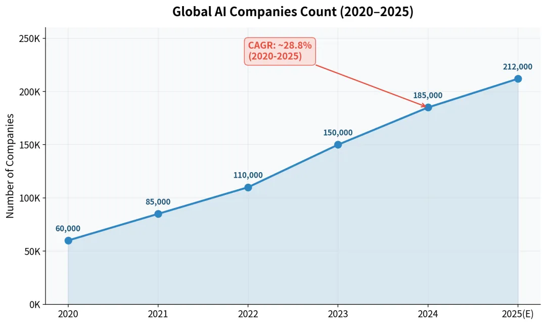 根据StartUs Insights的发现平台,截至2025年年底,全球约有212,230家活跃的AI公司,年增长率约9.68%。其他数据来源显示,2024年约有90,904家公司专注于AI,其中37%已获得A轮融资,9%已达到B轮或以上。