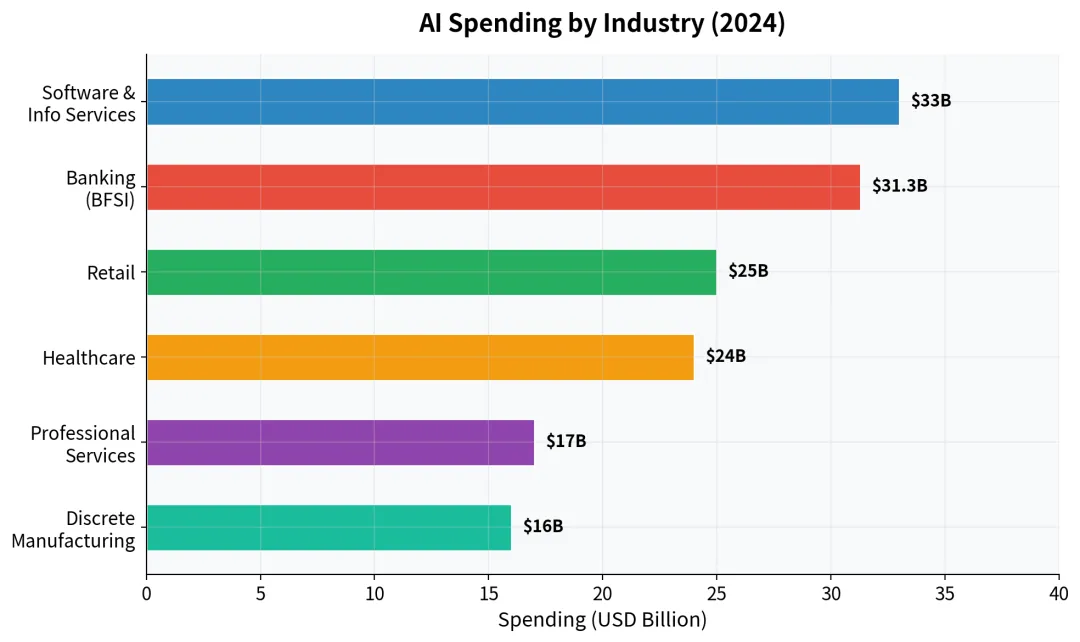 AI采纳覆盖了几乎所有行业,但投资和部署集中在几个关键领域。以下分析基于2024年支出数据和增长预测。