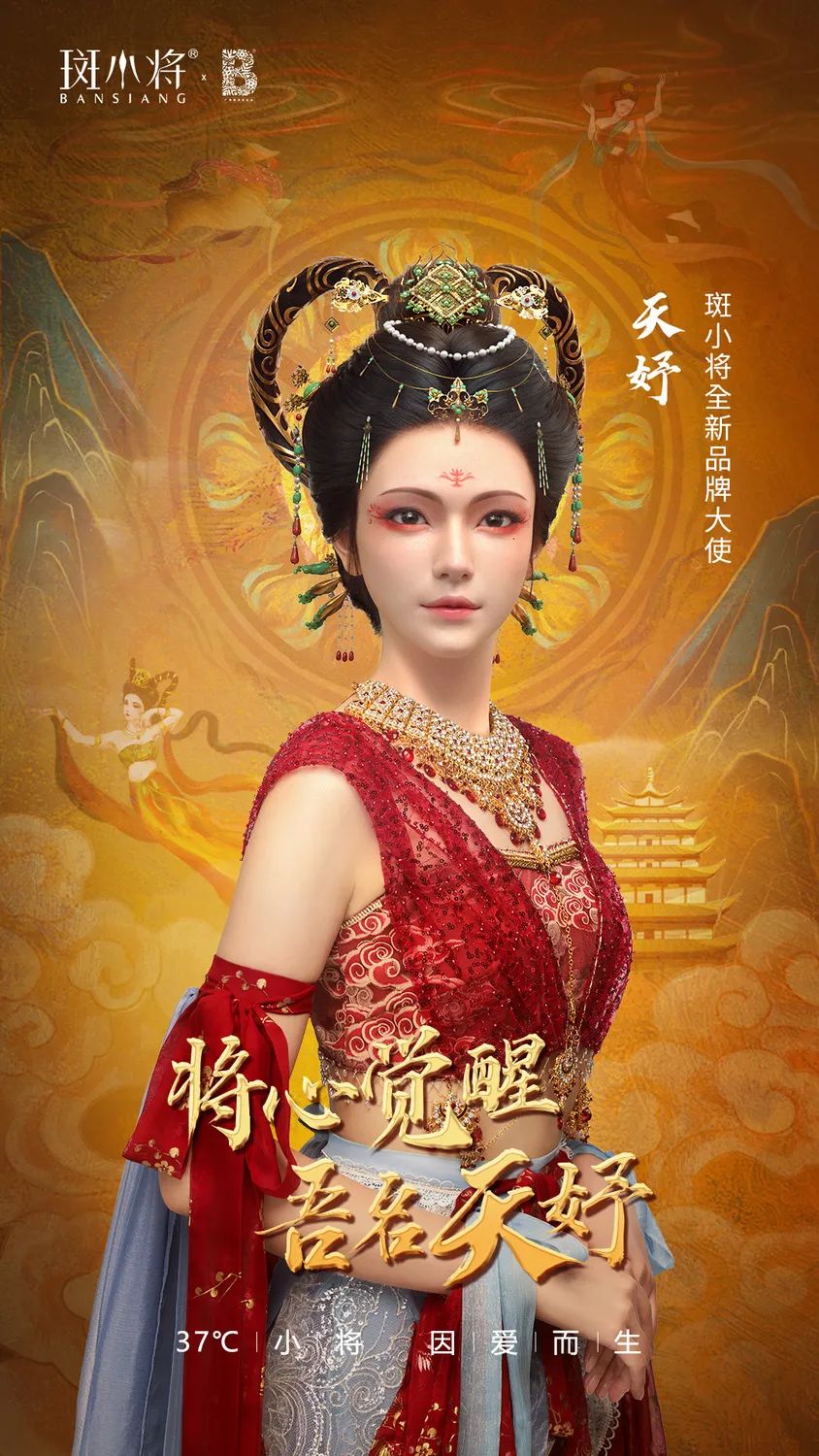 不仅如此,斑小将在5周年庆典上,宣布全新的品牌大使——天妤,以文化为载体,融合了天女、伎乐人等的服饰特色,将敦煌艺术的简洁美、繁复美相结合体现得淋漓尽致,通过这次合作,斑小将的东方美问候与科技的力量,努力将中华文化的精髓传播到世界的每个角落。