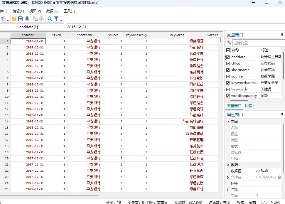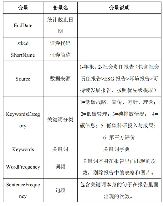 ▪ 数据价值:CNDD 企业年报碳信息词频数据集既破解了过往企业碳信息披露研究中量化测度难、维度覆盖不全、长时序连续数据缺失的核心痛点,为双碳目标背景下企业低碳行为的异质性特征与动态变迁规律研究提供了长周期、多维度的微观面板数据支撑,也为环境会计、公司金融、公司治理、环境经济等领域开展碳信息披露的影响因素、经济后果与作用机制等实证研究奠定了核心数据基础,同时可为监管部门完善碳信息披露制度体系、评估政策实施效果提供可靠的经验证据,兼具重要的学术研究价值与现实应用意义。