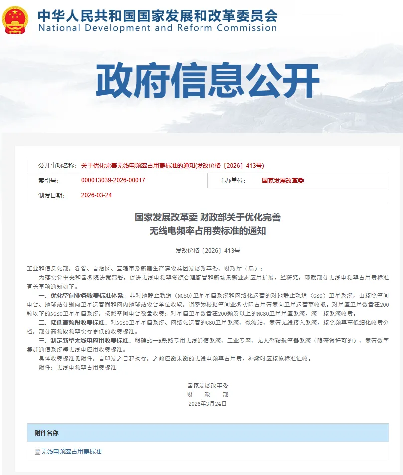 无线电频率占用费(发改价格〔2026〕413 号)的出台,是国家对频谱这一 “战略性稀缺资源” 的一次重大市场化配置改革,意味着从政策、产业、技术到经济层面的全面转向与升级。