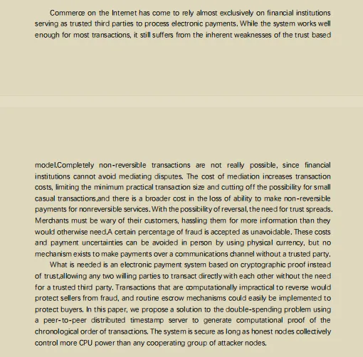 翻译内容网上一大推,我就不放了。 简单来说,我们现在在互联网那上的用的交易系统都是依托于三方基础上,淘宝来说,你并不是把货款打给了商家,而是打给了平台,一旦发生退款退货的问题,第三方中介就乔协调的作用。文红提到由于缺乏不可逆的支付数段,会引起互联网贸易首先,这个保持观点。比特币系统通过数学,密码学形成,不在基于信用。双方一旦达成协议,不需要借助第三方便可完成交易。一个去中心化的系统,要保护的是卖家。如果你想保护买家,第三方中介依然是好的选择。对于该系统的安全,作恶的节点不大于正常的节点,当然别后是一系列的算力成本,那这个系统就是安全的。