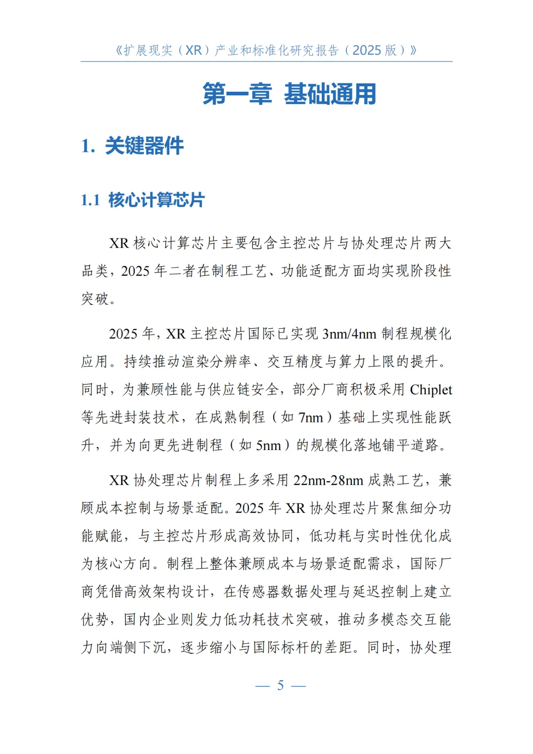 当前 XR 产业已进入技术全面突破、多场景规模化落地的关键阶段,核心器件与基础技术实现阶梯式升级,产业应用从试点走向全流程渗透。核心计算芯片方面,国际主控芯片实现 3nm/4nm 制程规模化应用,协处理芯片与 AI 深度融合,端侧大模型推理能力持续提升;近眼显示器件形成硅基 OLED、Micro-LED、LCoS 三大主流路线,行业已达成 30PPD 单眼角分辨率、100Hz 以上刷新率的共识目标;通信技术形成 “Wi-Fi 主导、蜂窝补充” 格局,5G-A 将端到端延迟压缩至 10ms 以内。应用层面,XR 已深度融入工业生产、文旅娱乐、教育培训等六大领域,工业端实现设计到运维全流程赋能,文旅端虚拟现实电影纳入行业管理体系,商贸端 AR 虚拟试穿成为标准配置。同时,XR 标准化体系持续完善,国内形成六大板块标准框架,2025 年多项国标落地,国际上 ISO、IEC 等组织同步推进终端、编码、交互等领域标准研制。