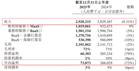 2025年,百融云创全年营业收入29.20亿元,同比下降0.31%,净利润只有0.74亿元,与2024年的2.66亿元相比,大幅下降72%。