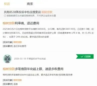 在黑猫投诉平台上,关于“榕树贷款”的投诉量已经超8500条。大量用户投诉该平台违规收取服务费,导致实际年化利率过高。有用户在该平台借款38000元,分12期归还,可实际所承担的年化利率却高达35%。