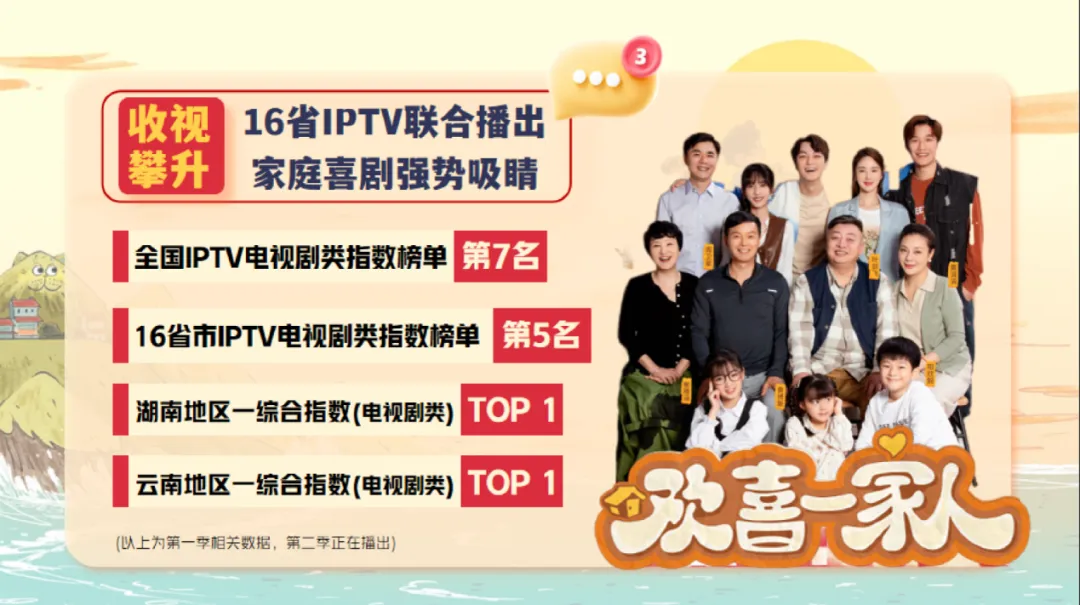 《欢喜一家人》目前正在热播,作为全国首部IPTV自制微短剧,获得国家广播电视总局多次推荐。“来家里做客"媒体点映会上,超20家主流媒体对该剧青睐有加。中国视听大数据(CVB)显示,《欢喜一家人》第一季在全国IPTV电视剧类指数榜单排名Top7,在联合播出的16个参投省份平台电视剧类指数榜单排名Top5,湖南地区综合指数排名Top1,云南地区综合指数排名Top1。