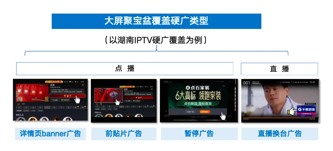 当前已走在电视营销前列的大屏聚宝盆,利用其跨省整合的优势,整合了全国各省份的硬广资源,涵盖电视前贴片、暂停等广告形式,可采用灵活多元的曝光组合方式,有效助推品牌打响知名度。