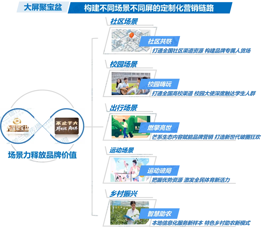大屏聚宝盆可充分整合优势渠道资源,与品牌共创整合营销活动,在其针对性人群的省份构建不同的触达场景,将大屏IPTV的用户从屏上引流至线下,实现屏上高频覆盖、线下零距离触达,助力品牌对用户进行心智占领并形成强认知。