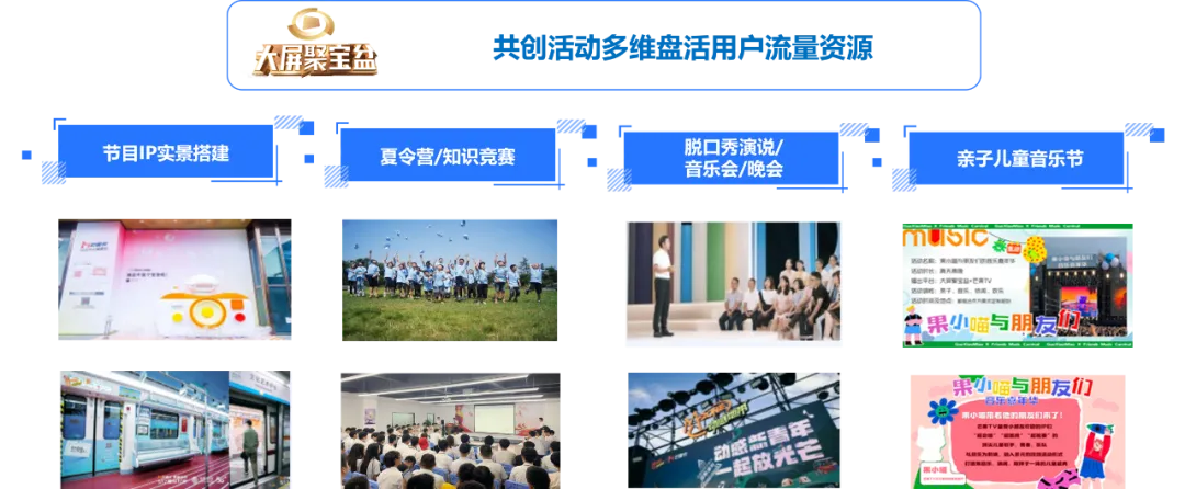 社区场景上,大屏聚宝盆打通全国社区渠道,基于品牌需求与品牌重点社区共联,可打造广场舞大赛、棋牌大赛、社区亲子活动等社区活动;校园场景中,基于大屏教育资源,可打造校园音乐节、脱口秀比赛、知识竞赛等相关校园活动;更可针对出行场景打造移动音乐会活动或针对亲子场景打造亲子运动会、儿童音乐节等多元化的营销活动。
