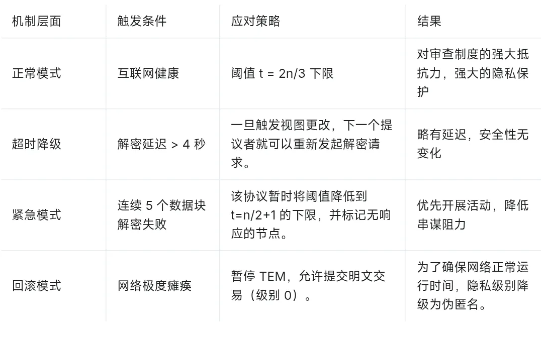 引入TEM的最大风险在于活动失败。如果解密委员会离线或拒绝提供解密片段,则该区块无法执行。Anubis设计了多层超时回退机制和动态阈值机制来降低这种风险: