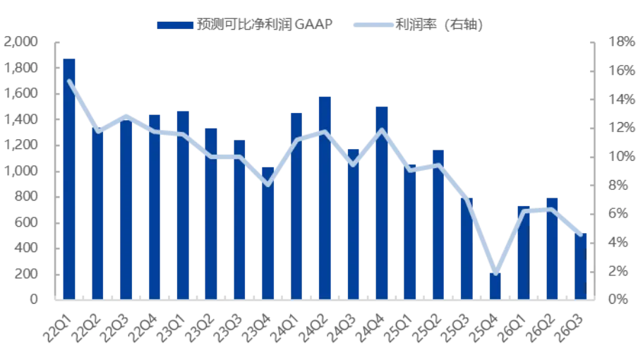 图表2:Nike预测可比净利润GAAP与利润率(单位:百万美元)