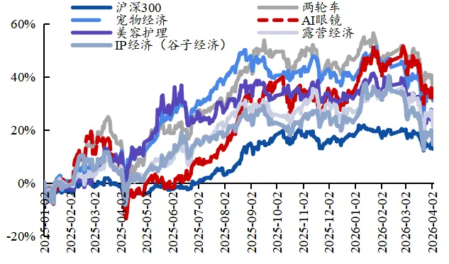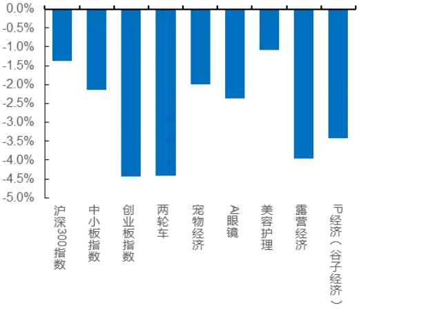 本周新消费相关板块中,两轮车涨跌幅-4.4%,宠物经济涨跌幅-2.0%,AI眼镜涨跌幅-2.4%,美容护理涨跌幅-1.1%,露营经济涨跌幅-4.0%,IP经济(谷子经济)涨跌幅-3.4%。