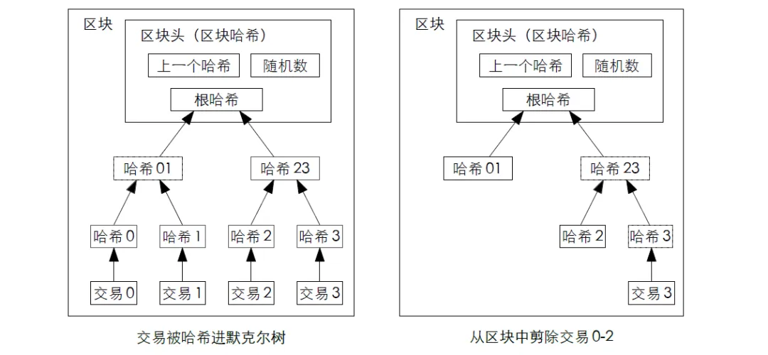 一旦某个货币的最新交易已经被足够多的区块覆盖,这之前的支付交易就可以被丢弃以节省磁盘空间。为便于此而又不破坏区块的哈希值,交易将被哈希进默克尔树[7][2][5],只有根节点被纳入到区块的哈希值,老的区块可通过剪除树枝的方式被压缩,树枝内部的哈希不需要被保存。