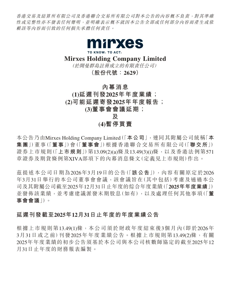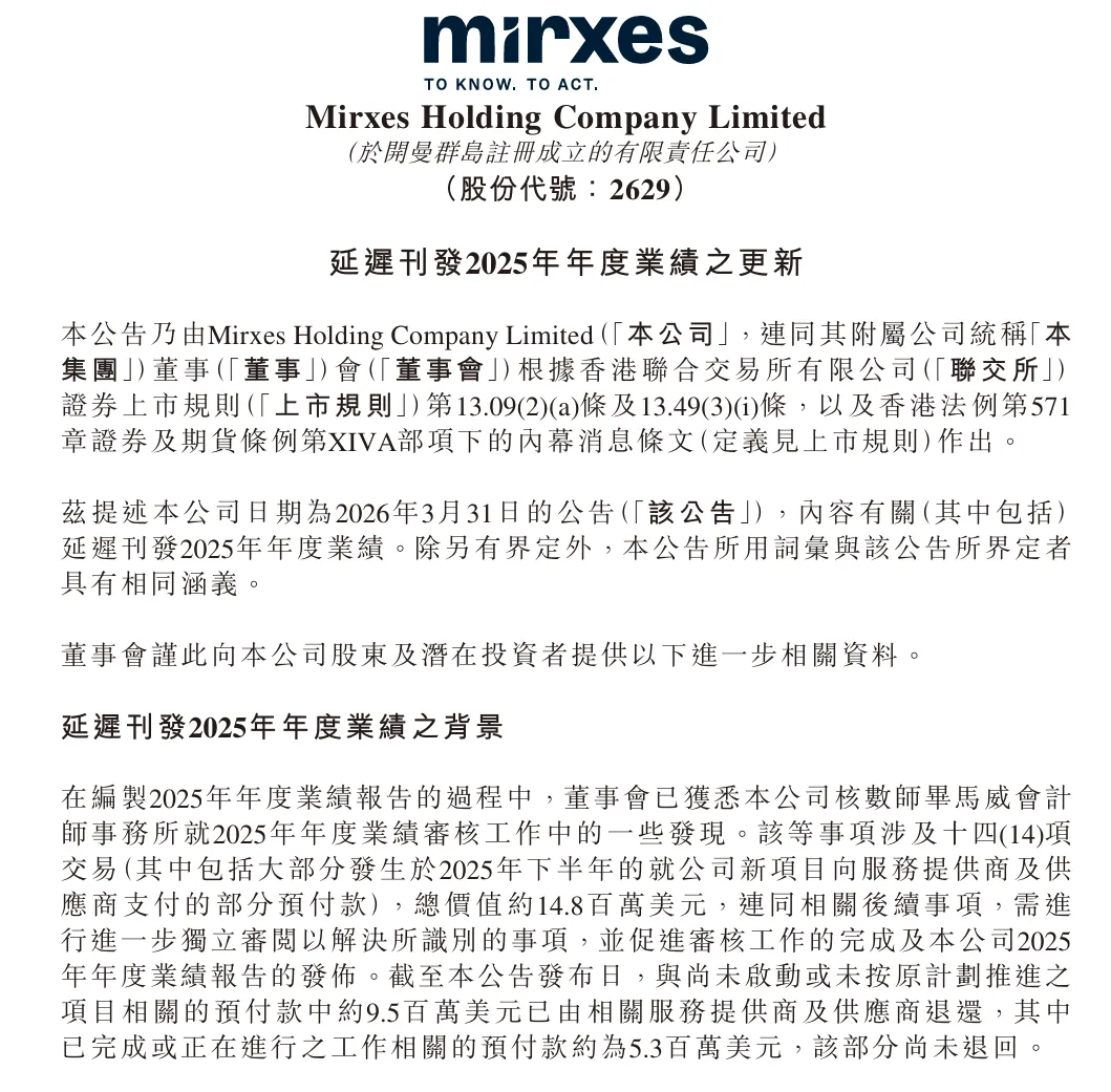 4月2日,觅瑞发布公告,披露了更多了细节:审计机构毕马威在审核2025年年报时发现14笔、总额约1480万美元的预付款事项,其中已有约950万美元被相关服务方退还,剩余约530万美元为已完成或正在进行的工作相关的预付款。公司同时宣布成立独立调查委员会,委任律师行及专业机构协助审查。