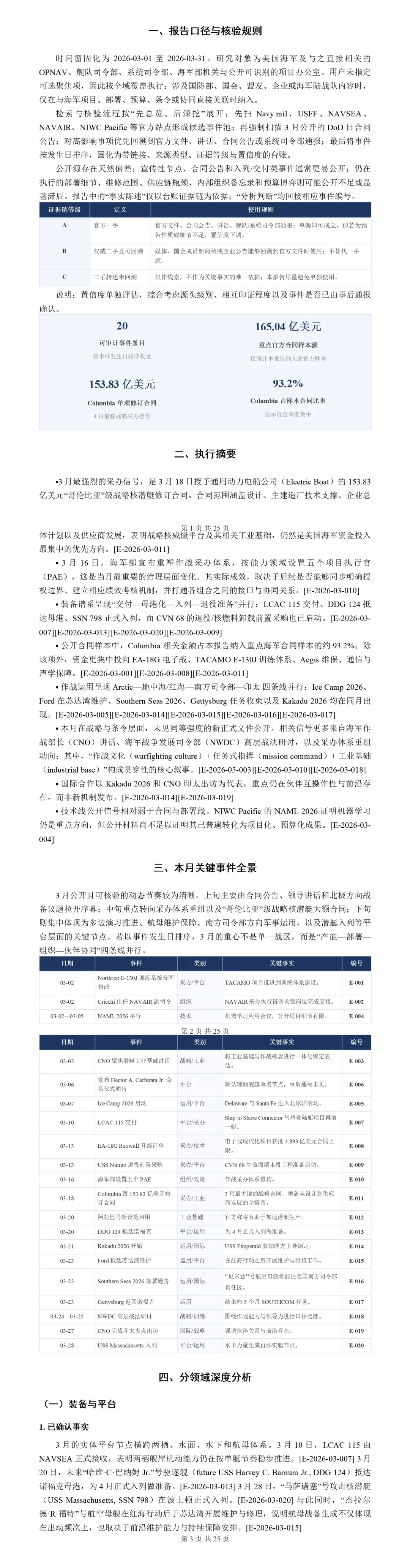 3月最值得付费阅读的主线,是“战略核威慑平台与潜艇工业基础重新站上绝对中心”。哥伦比亚级单项合同占重点官方合同样本约93.2%,再叠加潜艇工厂启用、北极潜艇活动和新攻击核潜艇入列,整个月报实际上围绕“水下力量生成—工业扩容—现实运用”形成了一条很清晰的主轴。