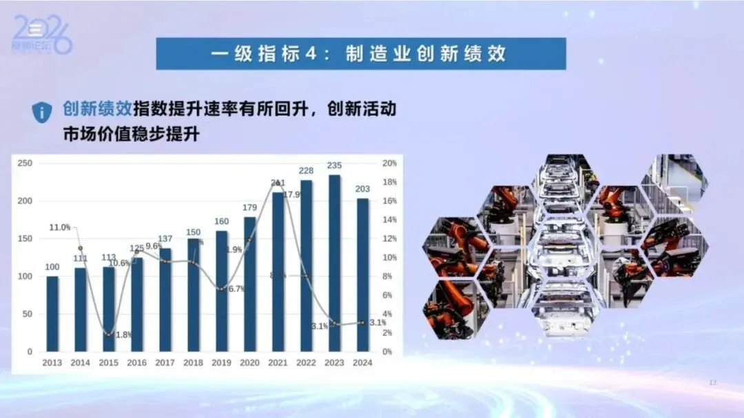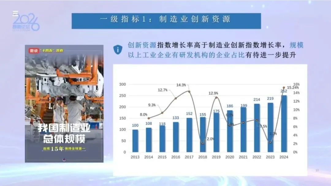报告表明,创新乃是制造业高质量发展的核心的引擎,我国制造业正处在从“量的积累”朝着“质的飞跃”转型的关键时期。为科学定量核定制造业创新发展态势,报告搭建了涵盖“创新资源、创新产出、创新协同、创新绩效、创新环境”五个一级指标的制造业创新指数体系,从国家级以及区域两个层面予以系统评估。