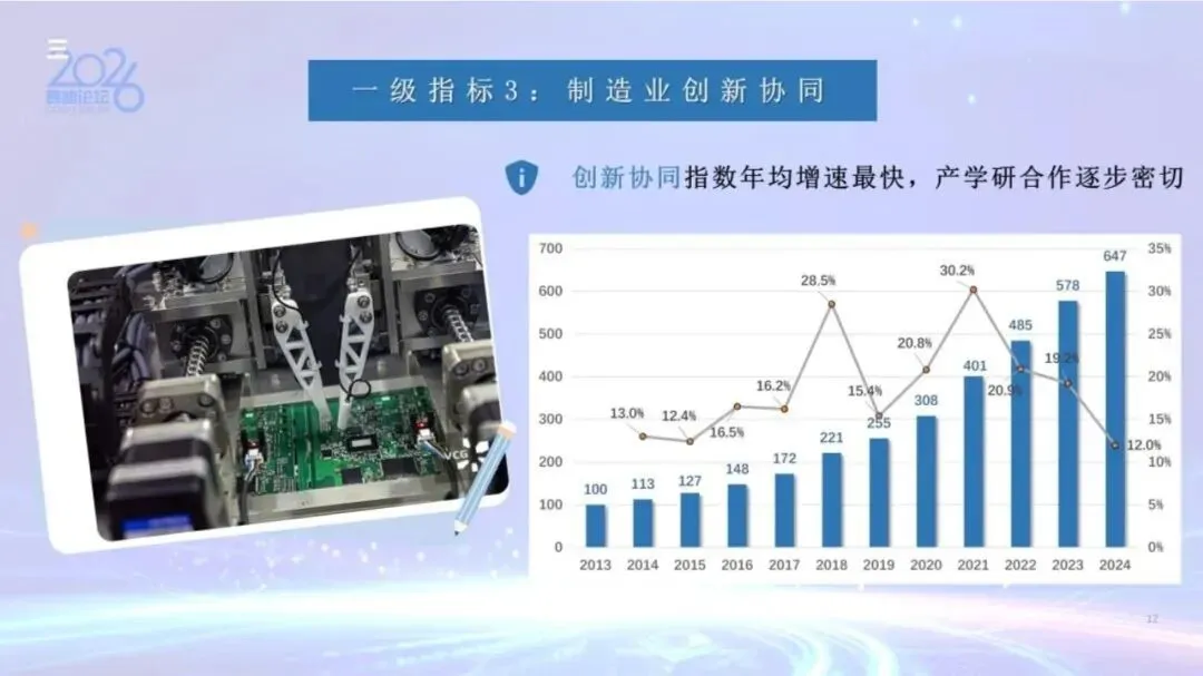 在2019年至2024年这个时间段内,我国国家级制造业创新指数在整体上呈现出保持上升的态势,然而在近三年里,其增速却是连续出现下滑的情况,这一现象反映出创新动能存在有所减弱的状况。其中,“创新协同”指数的年均增速是最快的,产学研合作呈现出逐步密切的态势;“创新产出”有显著的提升,规模以上工业企业的有效发明专利数增长格外突出;“创新绩效”指数出现回升,创新活动的市场价值稳步增强;而“创新环境”指数的增速相对而言是较低的,仍旧需要进行优化。