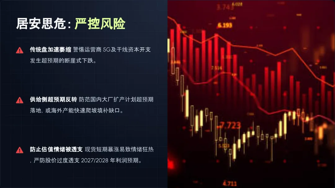 传统需求持续超预期衰退风险:如果未来,占据大头的运营商传统通信网需求(如干线、5G建设)的资本开支出现进一步的断崖式下调,导致传统光缆板块的下滑幅度远超目前的20%,那么光靠数据中心和无人机带来的增量市场,就会面临难以完全对冲基本盘收缩的风险。
