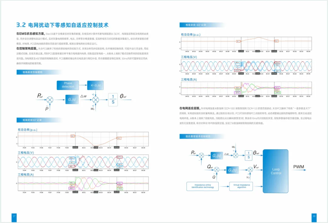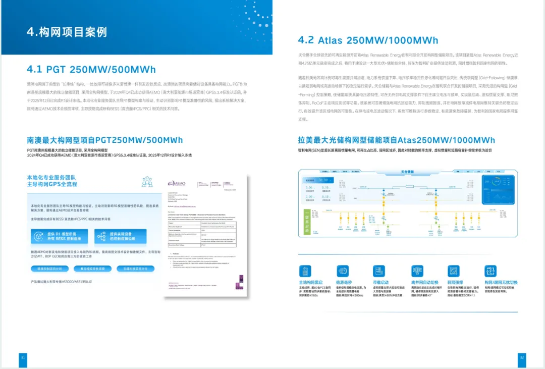 落地案例上,展示了澳洲 PGT 250MW/500MWh、智利 Atlas 250MW/1000MWh 两大构网型储能项目,适配当地弱电网特性,通过全构网设计通过权威认证,实现黑启动、离并网无扰切换等功能,有效提升电网稳定性。