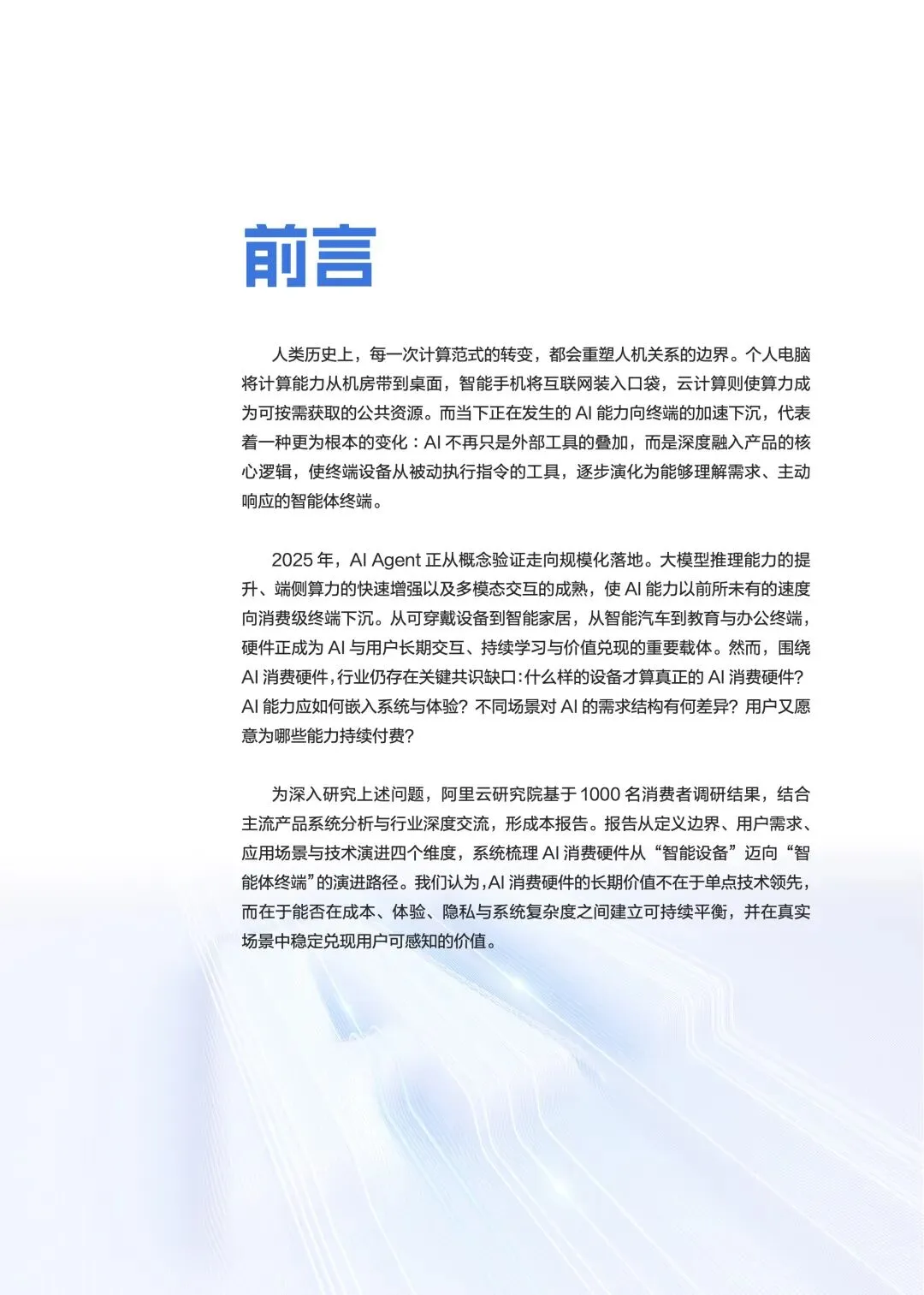 AI 消费硬件从联网设备→智能设备→端侧智能体升级,核心是把感知、理解、决策、执行嵌入系统。用户追求可感知价值:个性化、自动化、降本提效。主流场景包括可穿戴、教育办公、家居、车载、娱乐影像;技术主线为端云协同、多模态交互、智能体化。用户愿意为健康、办公、清洁等刚需付费,10-30 元 / 月订阅接受度最高。