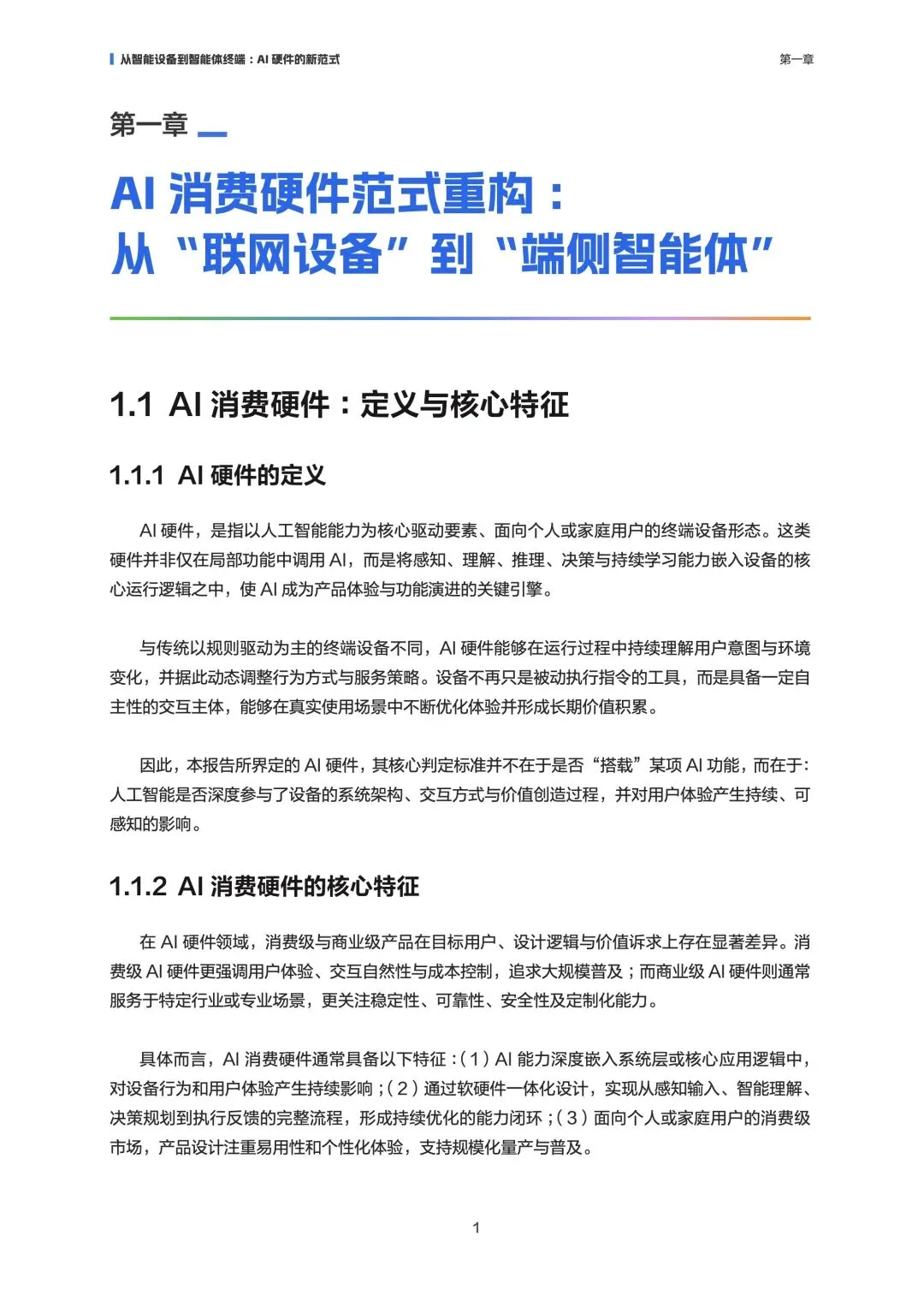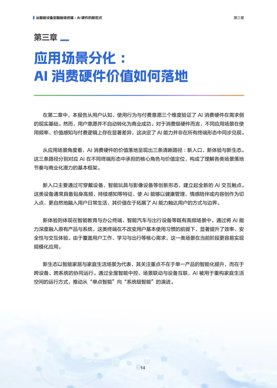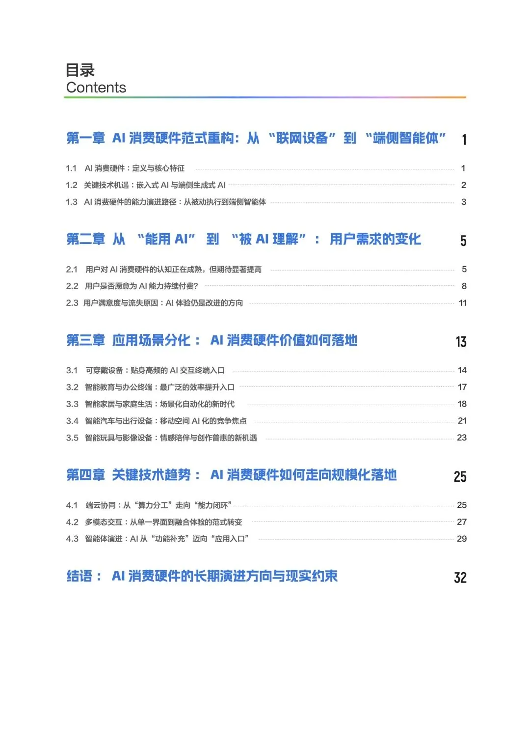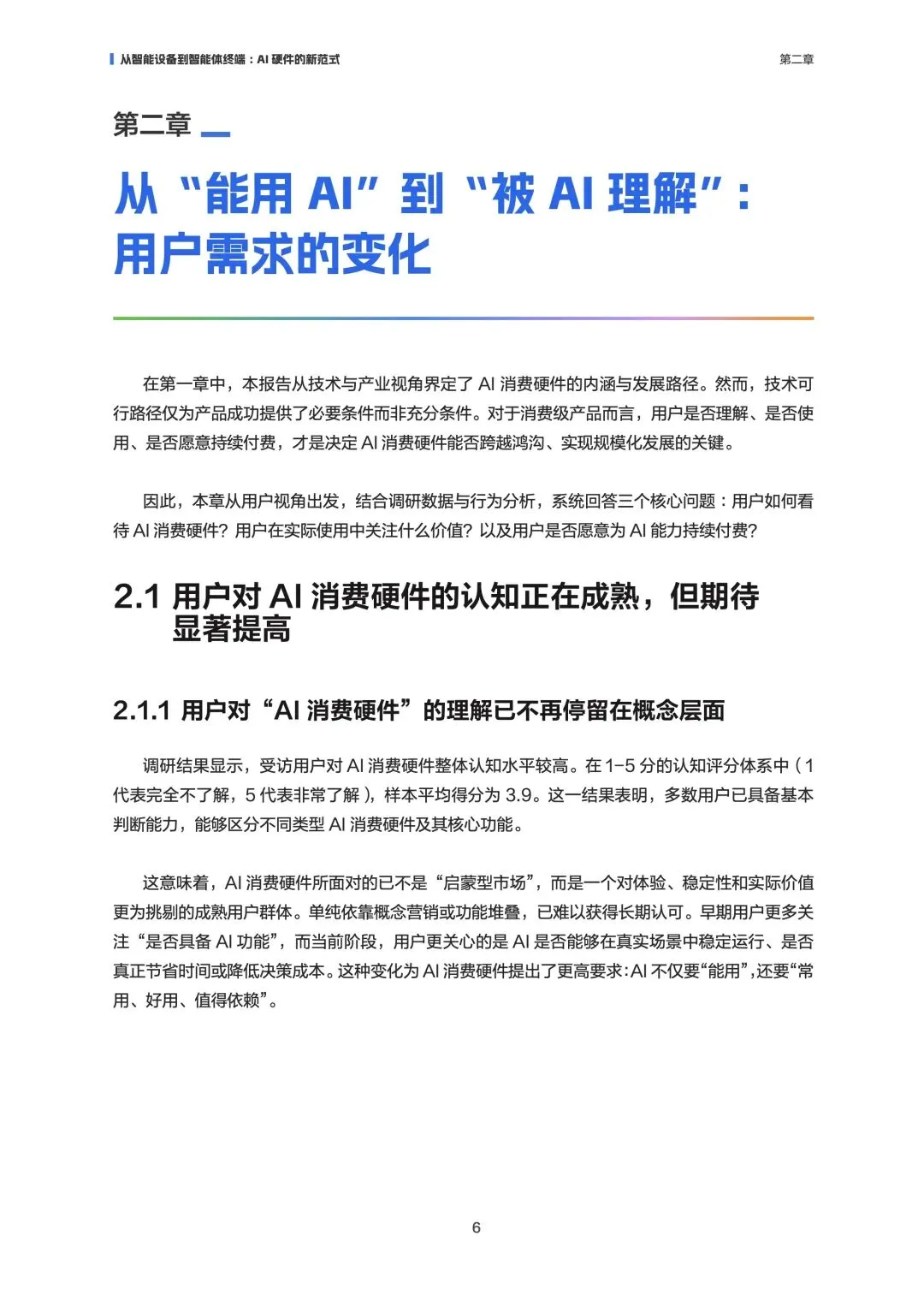 AI 消费硬件不再是叠加功能,而是形成感知 - 理解 - 决策 - 执行 - 学习闭环,走向端侧智能体。分为三层演进:基础自动执行、分析建议、长期协同。成熟产品能自主拆解任务、跨设备联动、持续优化,标志是 AI 融入系统架构,而非外挂功能,核心竞争力是稳定、可用、可感知的真实价值。 - 用户需求明确:为刚需付费,拒绝噱头