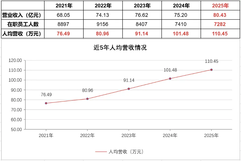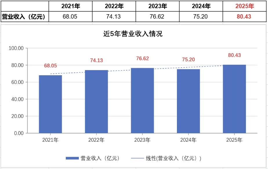 2025年营业收入80.43亿元,比2024年增长6.95%。