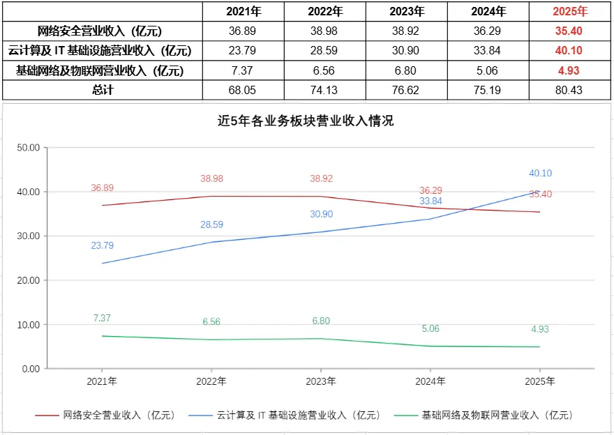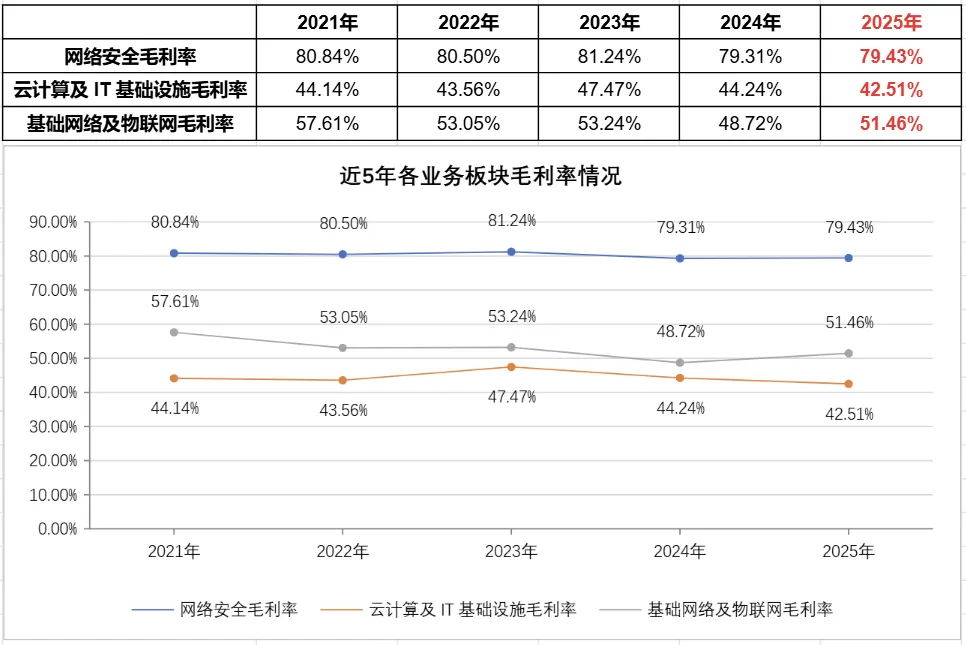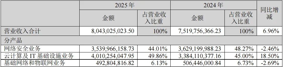 2025年云计算及IT基础设施业务收入为40.10亿元,同比增长18.50%,收入占比上升至49.86%,是驱动公司整体收入增长的核心业务板块。2025年网络安全业务收入为35.40亿元,同比小幅减少2.46%,占公司整体收入比重为44.01%。2025年子公司信锐网科积极优化业务结构、稳固核心基本盘,实现基础网络及物联网业务收入4.93亿元,同比减少2.69%,占公司整体收入比重为6.13%。