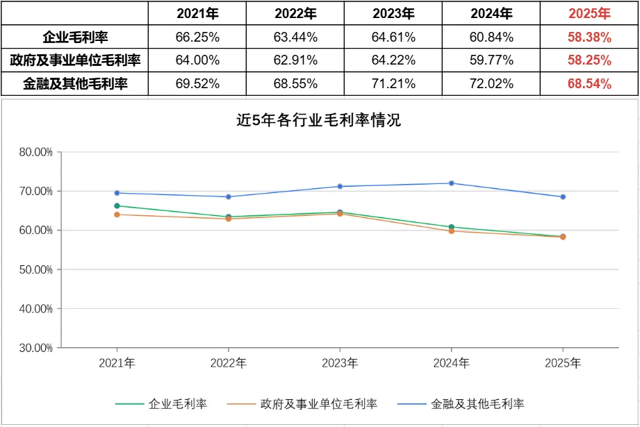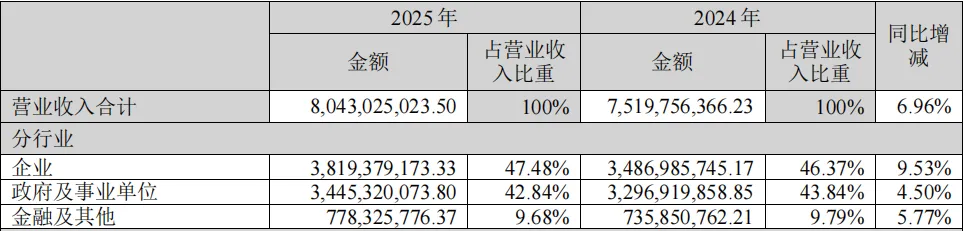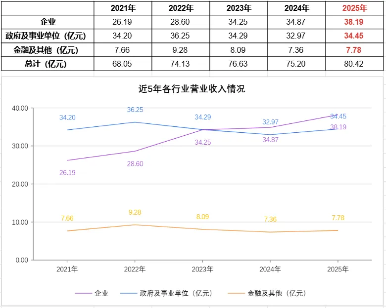 2025年企业收入为38.19亿元,同比增长9.53%,收入占比上升至47.48%。2025年政府及事业单位收入34.45亿元,同比增长4.50%,收入占比下降至42.84%。2025年金融及其他收入7.78亿元,同比增长5.77%,收入占比下降至9.68%。